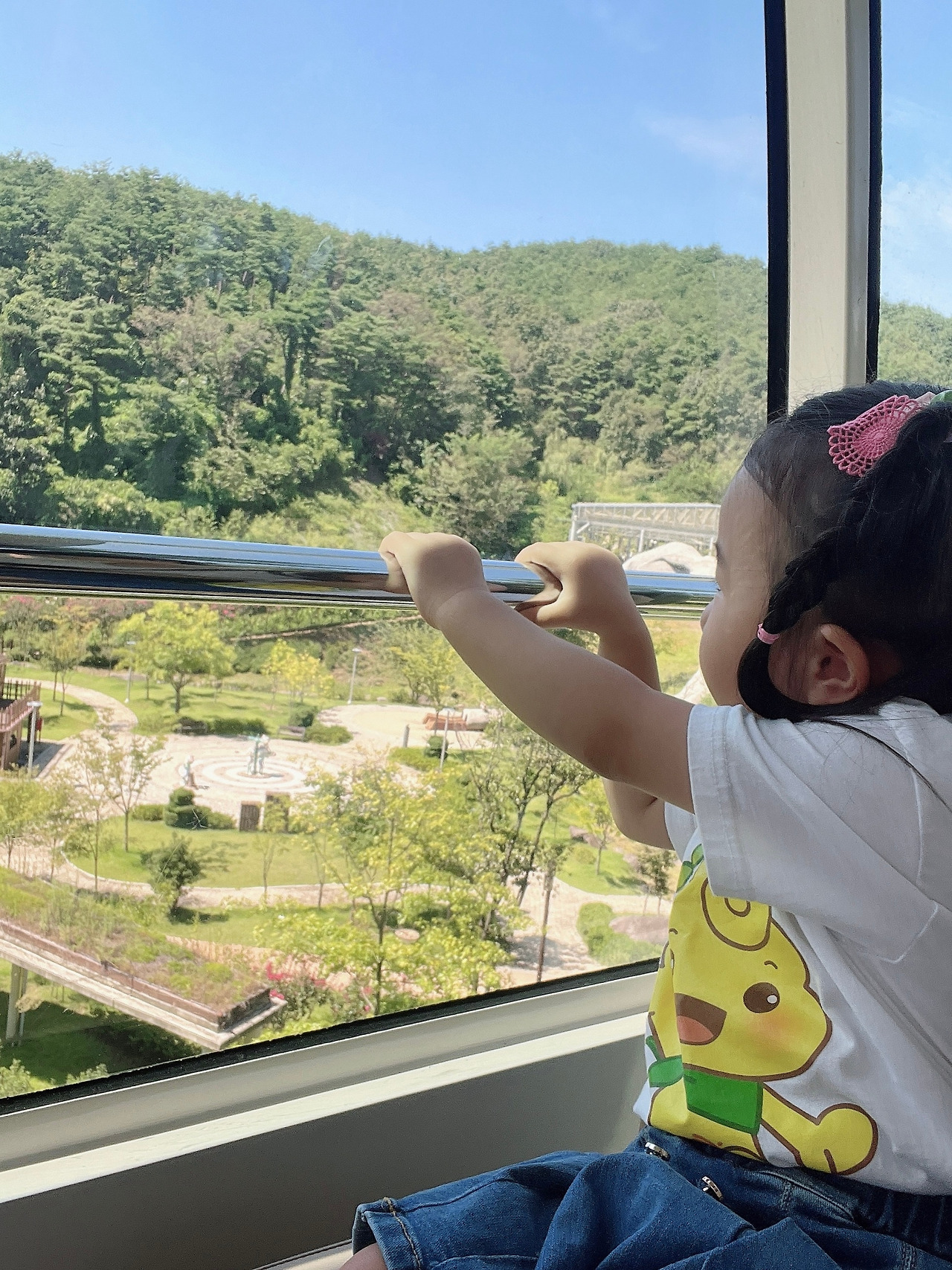 모노레일을 타고 가는 동안 주변에 보이는 풍경은 온통 초록초록한 나무로 우거진 숲이었다. 보는 것만으로 마음이 평안하고 기분이 좋아졌다. 수지도 창밖으로 보이는 풍경을 구경하기도 하고, 움직이는 모노레일을 신기해하며 재밌어했다.