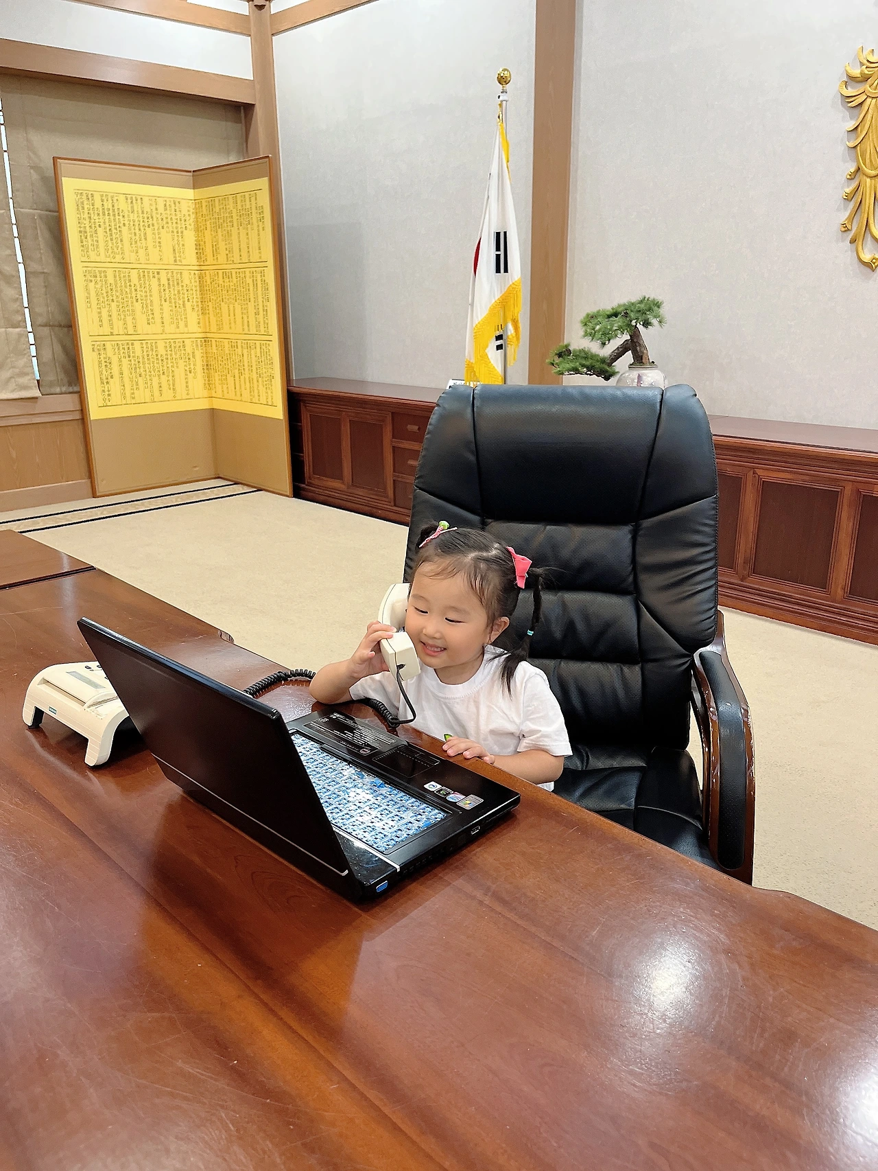 오늘 청와대에서 수지가 가장 오래 머물고 좋아한 곳은 대통령 집무실이었다. 그곳에 있는 책상에 전화기와 노트북이 있었는데, 수지가 의자에 앉아서 전화기의 수화기를 들고 “여보세요? 네, 네.” 하며 전화통화도 하고 키보드가 빠져있는 노트북에 손을 올리고 타자를 치기도 했다. 그러면서 너무 재밌게 놀았다. 그런 수지가 너무 귀여워서 나와 남편도 한참 구경했다.