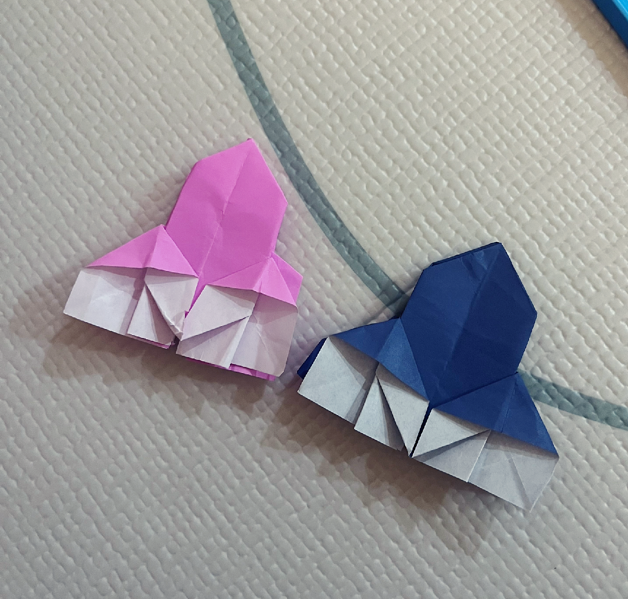 영상을 틀어놓고 보면서 만드는데, 수지도 내 옆에 앉아서 고사리 같은 손으로 꼼지락 거리며 로켓을 만들었다. 수지가 만들다가 어려워하면 영상을 멈추고 도와줬다. 그렇게 해서 우리 모녀는 함께 색종이로 로켓을 완성했다.