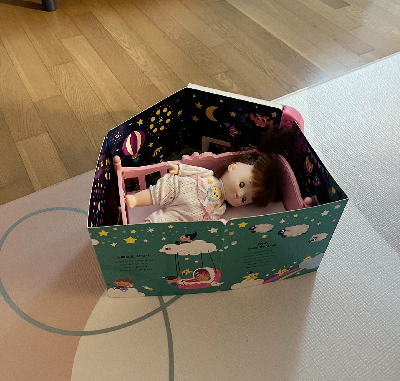 장난감 아기 침대에 콩콩이 인형이 고이 누워 있었고, 침대 주변은 자장가가 나오는 책으로 빙 둘러져 있었다. 마치 콩콩이만의 아늑한 공간을 만들어준 듯했다.
