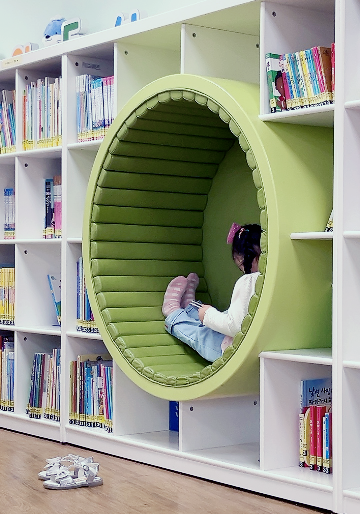 도서관에서 봉사하시던 어르신도 수지 앞에 다가와, 미소를 머금은 채 한참을 지켜보다 가셨다. 작은 아이가 편안한 자세로 책을 읽는 모습이 어르신 눈에도 사랑스러워 보였나 보다.