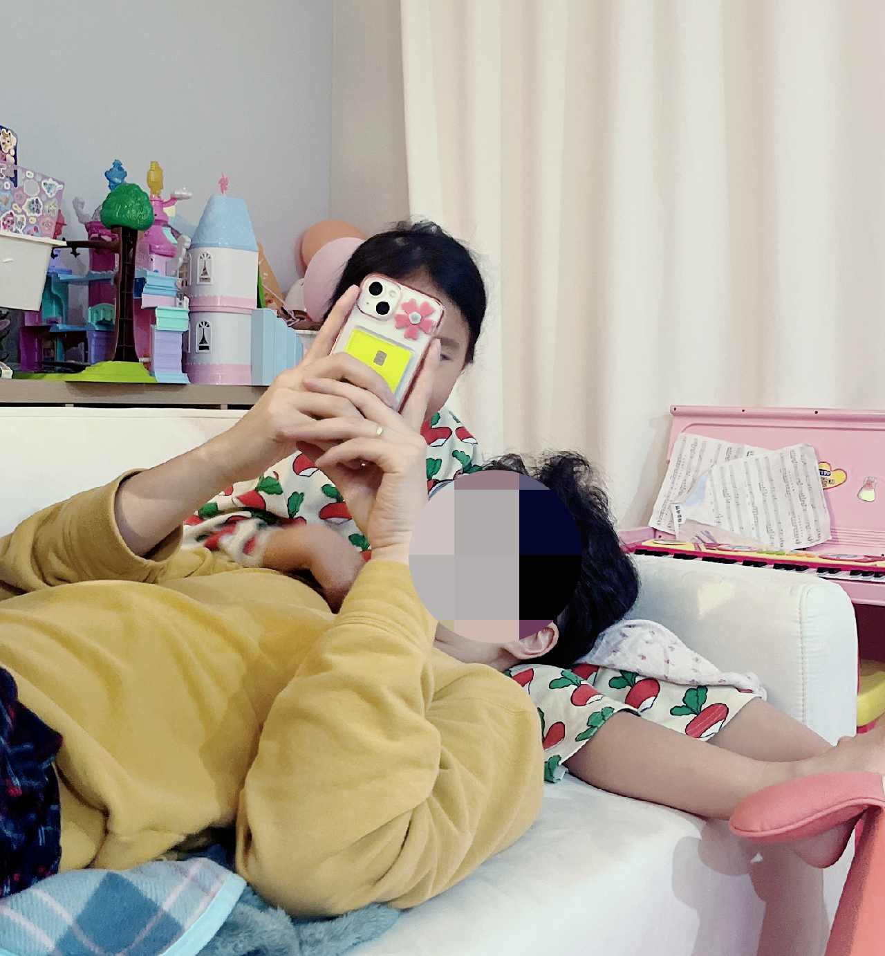 남편은 "아빠는 수지 무릎베개가 제일 좋아!"라고 말하며 애착베개라도 안듯 수지의 다리를 쓰다듬고는 머리를 기대어 누웠다. 남편은 무척 편안해 보였고, 수지는 자기 다리에 누운 아빠를 지그시 바라보며 환하게 웃었다.