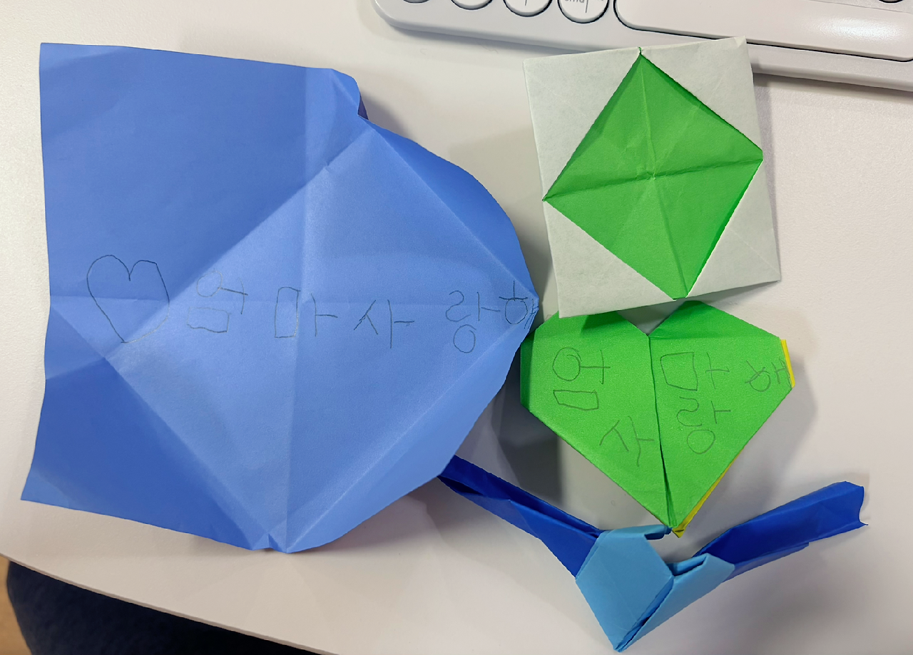 이마에 수건을 올려주고, 귤을 까주고, 청소를 하고, 빨래를 개는 것으로도 모자라 편지와 색종이까지 접어 주었다. 어떻게 해서든 엄마에게 사랑을 전하고 싶었던 마음이 너무나 절실하게 느껴져 마음이 따뜻해졌다.