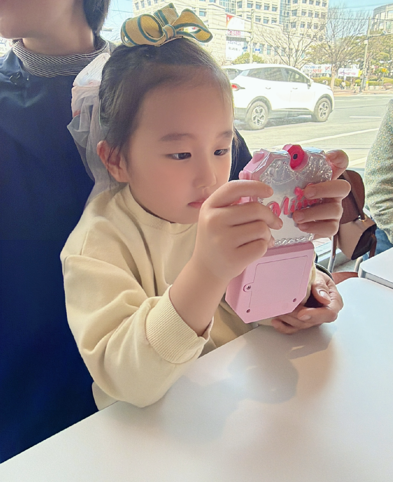 결국 카페에서 나올 때까지, 수지는 이모 무릎을 의자 삼아 앉아 있었다. 이모 앞에 앉아 케이크도 먹고, 유아용 핸드폰으로 놀이도 하며 즐겁게 시간을 보냈다.