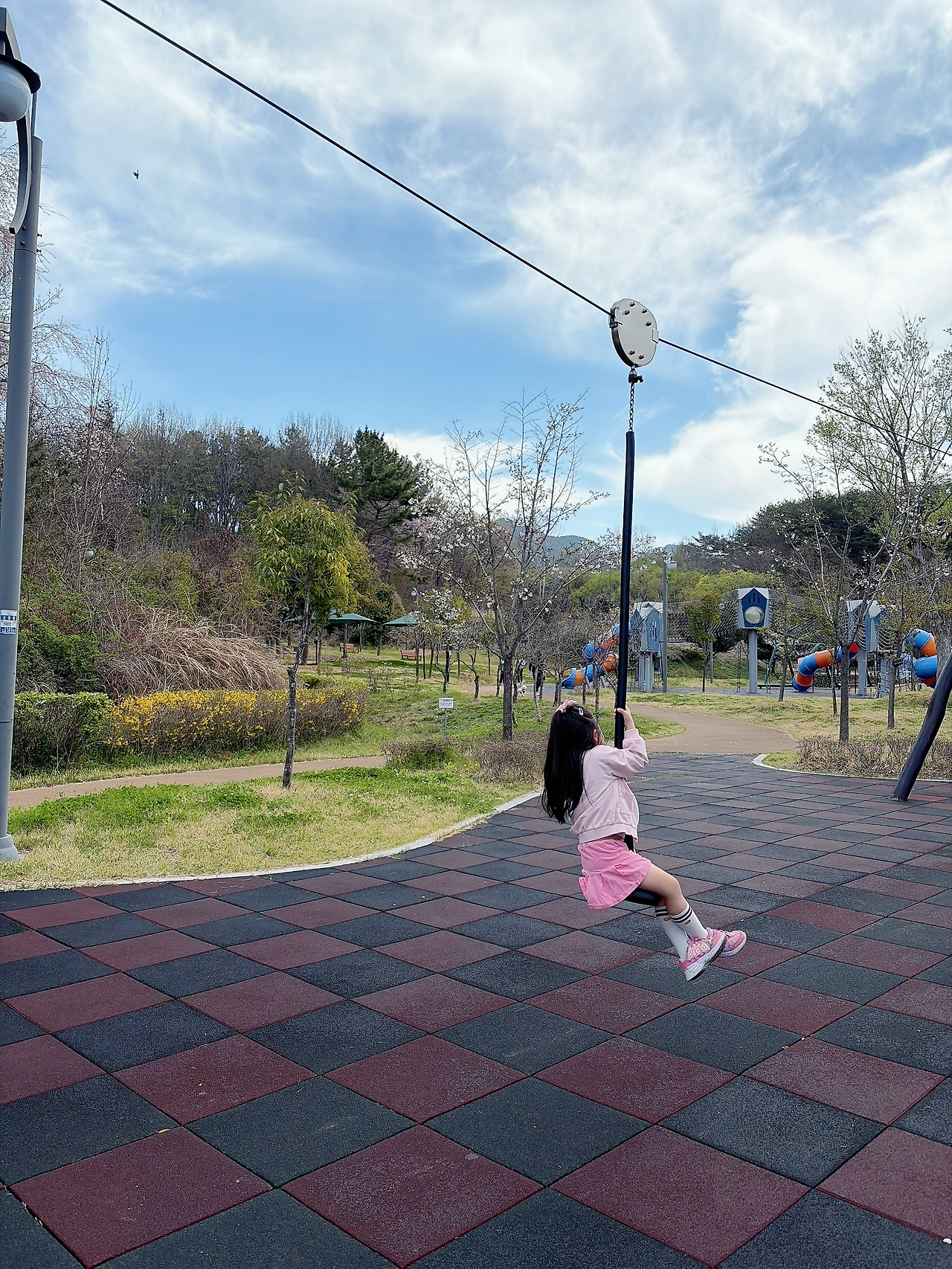 지난 주말, 벚꽃이 아름답게 피어 있는 금호지에 나들이를 갔다. 산책로를 따라 벚꽃을 구경하다가, 놀이터를 발견한 수지는 신이 나서 달려갔다.