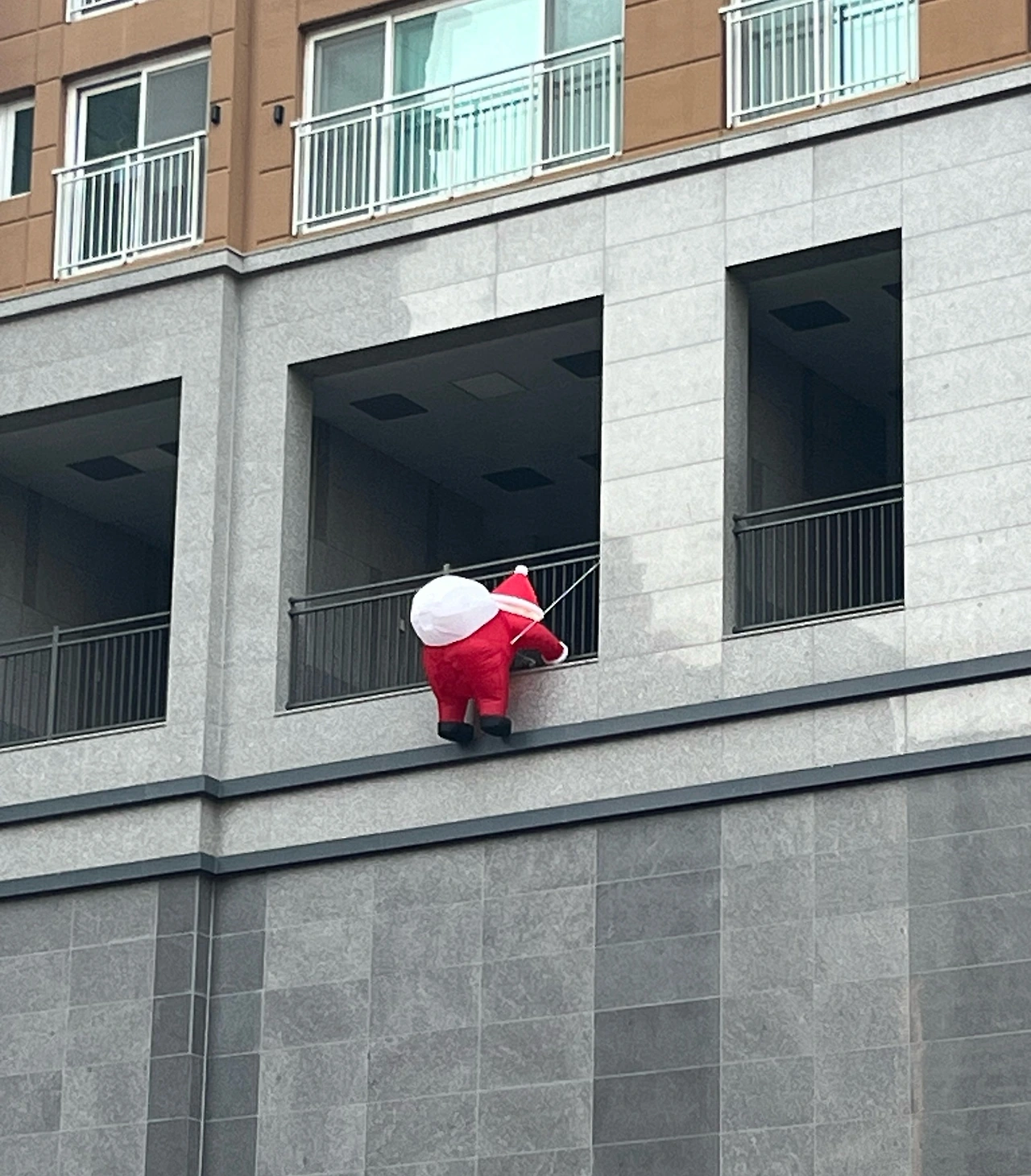 아이 하원하고 같이 놀이터에 가는 길에 아파트에 산타 할아버지가 매달려 있는 걸 봤다.