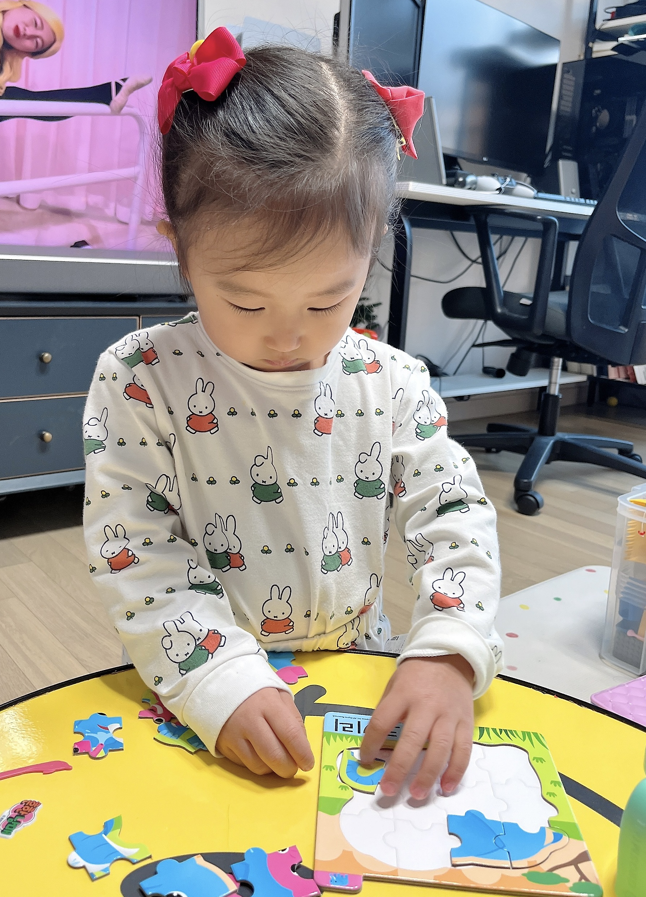 수지가 퍼즐 조각 모양을 보고 퍼즐 판에 맞추는 게 봐도 봐도 너무 신기했다. 퍼즐을 맞추는 아이는 나도 처음 보는 거라 더 신기했다.