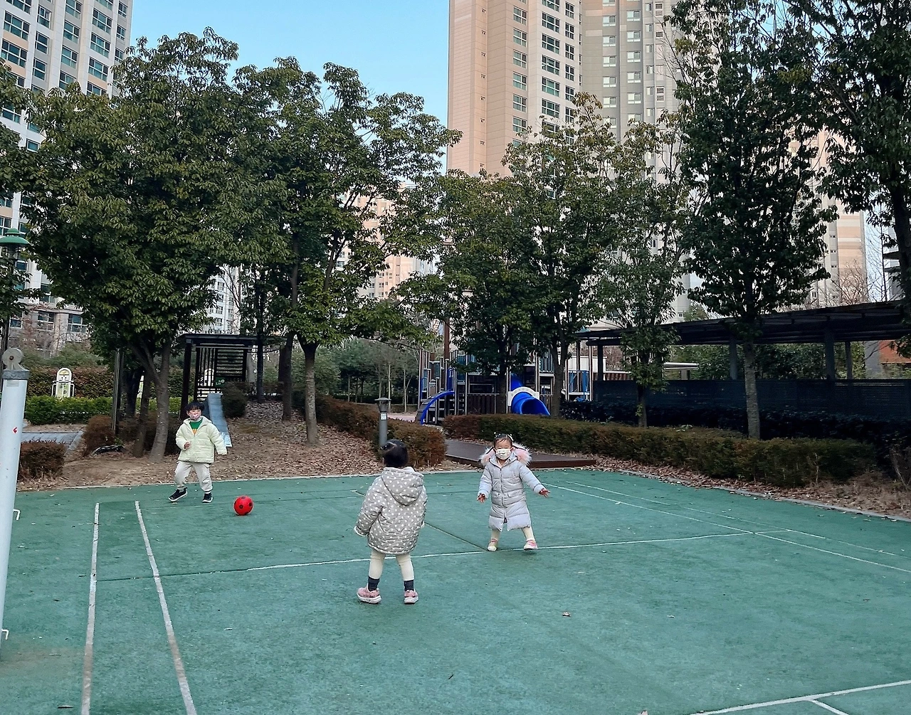그 아이도 수지와 같이 공놀이를 하는 무리에 껴서 놀고 싶은데 선뜻 들어와서 놀기가 쑥스러웠던 모양이다. 아이 엄마가 손을 잡고 공놀이를 하는 우리 아이들 곁으로 왔다. 그리고 “우리 ㅇㅇ 이도같이 공놀이하고 싶나 봐~ 같이 놀자” 하며 아이를 무리 곁에 데려다 놓았다.