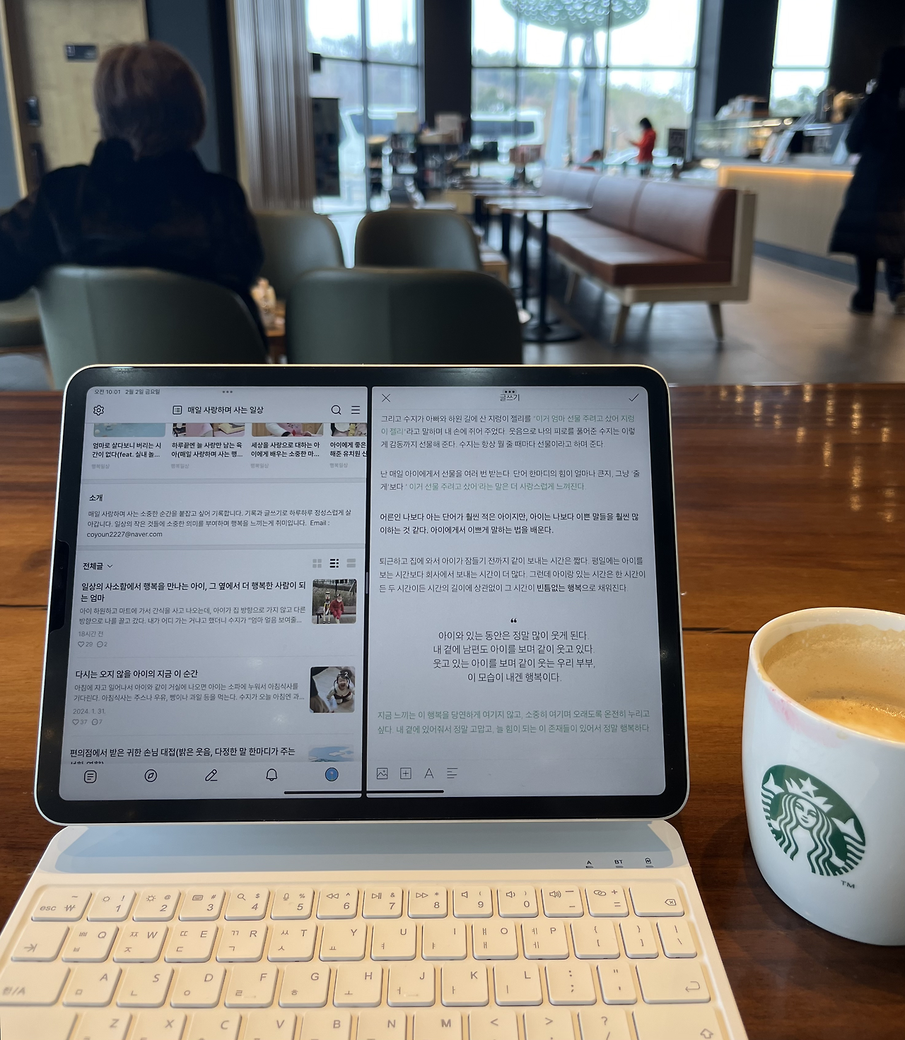 그리고 카페에서 글을 쓰면 새로운 공간에서 얻는 영감도 있고, 카페의 음악이나 사람들의 소리로 약간의 소음이 있지만 글에 집중하다보면, 처음엔 뚜렷하게 들리던 주변 소리도 어느새 희미하게 들린다. 그만큼 글에 집중하게 된다.