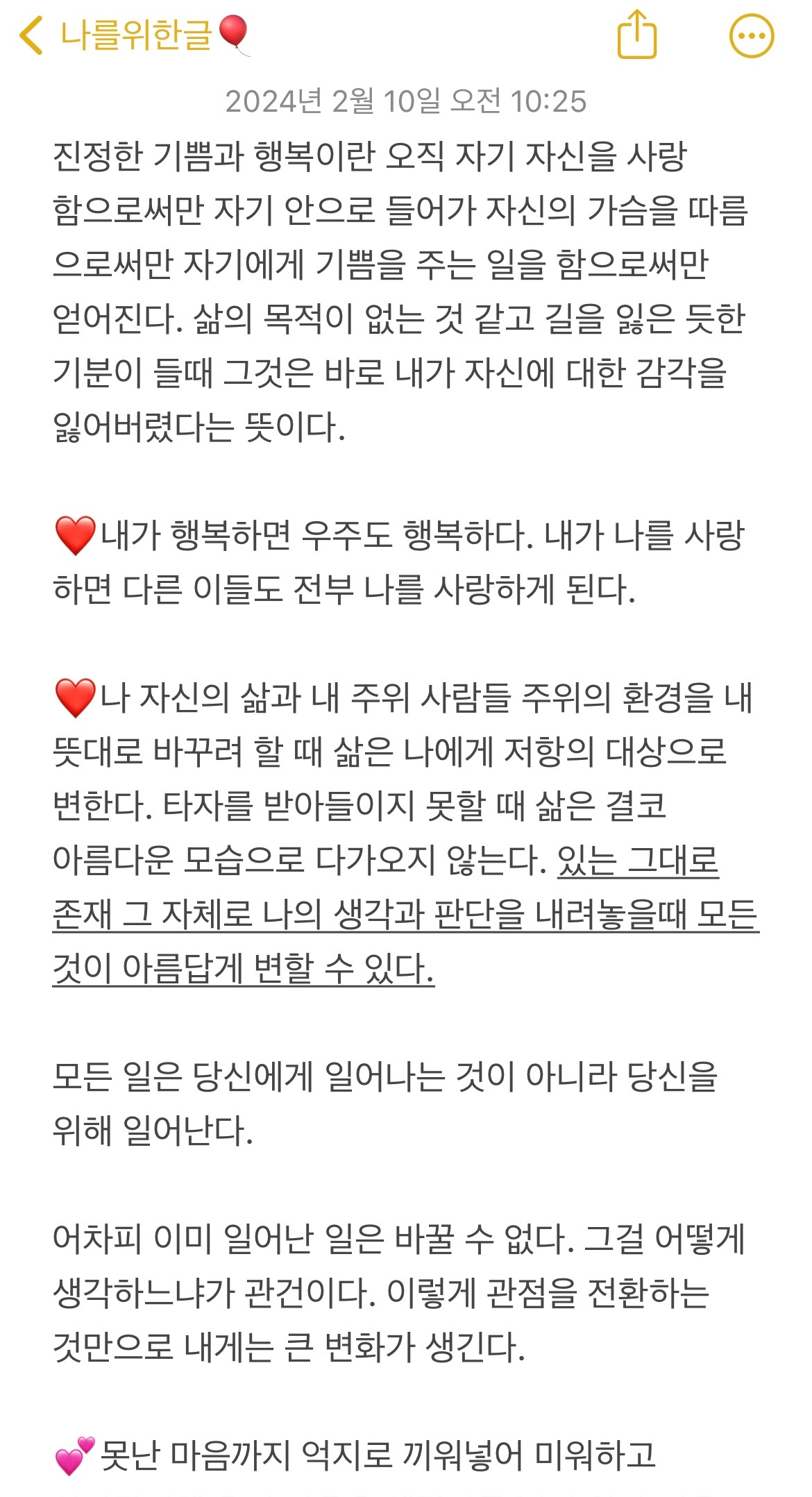 좋은 글은 내 마음에 좋은 영양분이 되고 정신을 건강하게 해 준다. 수시로 좋은 글로 가득한 메모장을 들여다보고, 그날 유독 마음에 와닿는 글들은 필사를 해가면서 음미한다. 많은 문장을 보지 않아도 단 한 문장이 나의 하루를 지켜주기도 한다.