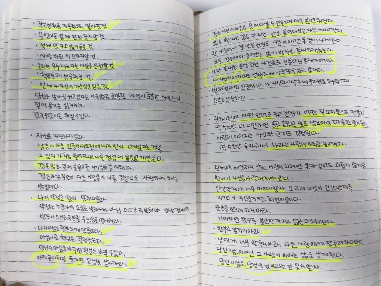 좋은 책 한 권을 다 읽고 나면, 저자가 말하고자 하는 메시지가 내 마음에 닿아서 나에게 좋은 영향을 미치고 좋은 생각을 남긴다. 내가 모은 문장은 나를 위한 메시지고, 내 인생 길잡이가 되는 책이기도 하다. 그래서 늘 이 책을 가지고 다니며, 나 자신에게 좋은 영향을 준다.