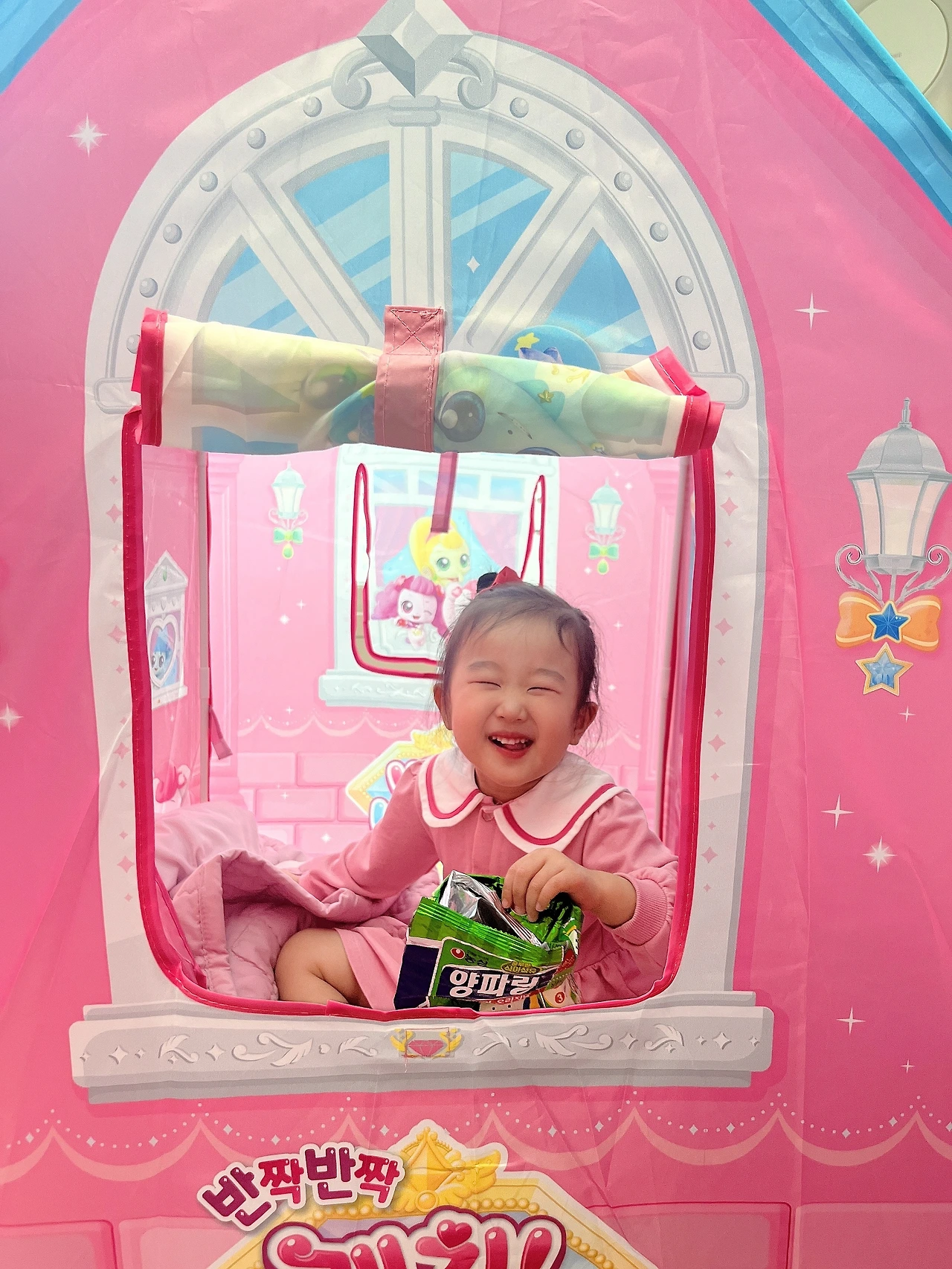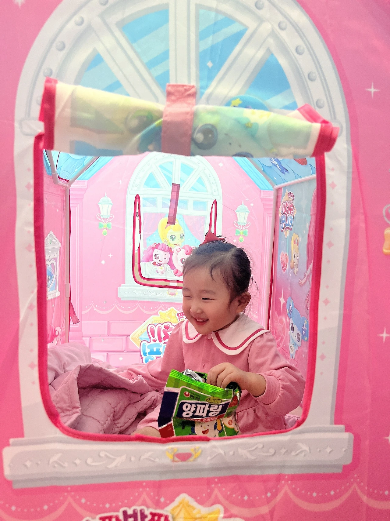 수지는 자기만의 아늑한 공간에 자기가 좋아하는 모든 걸 가져다 놓고 그 텐트를 더 귀엽고 사랑스럽게 꾸몄다. 텐트 안에 들어가서 해맑게 웃는 아이는 장난감 나라안에 있는 인형 같았다. 텐트에 그려진 티니핑들보다 수지가 훨씬 귀여웠다.