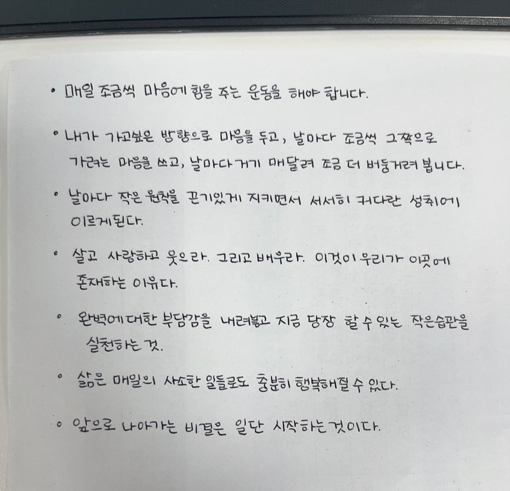 그래서 다른 글도 여러 개 적어보았습니다. 원래의 제 글씨보다 훨씬 이뻐진 글씨체가 나왔습니다! 제가 제 손으로 적는데 어제의 글씨와는 확연히 다른 글씨가 나왔습니다. 속으로 탄성이 나왔습니다.
