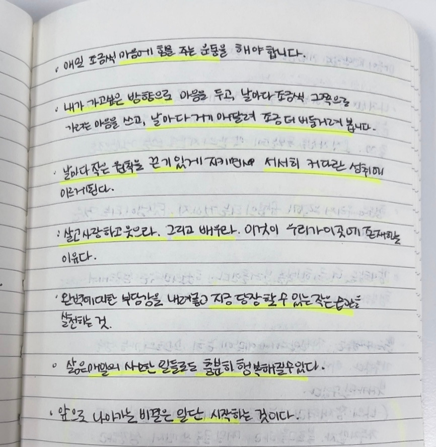 그런데 제 글씨가 그리 이쁘진 않습니다. 글자를 이쁘게 써서 내가 써놓은 글을 보며 좋은 기분이 들었으면 좋겠는데, 신경 써서 쓴다고 해도 조금만 지나면 망가진 모양으로 날아가는 글씨를 볼 때마다 괜히 속상했습니다.
