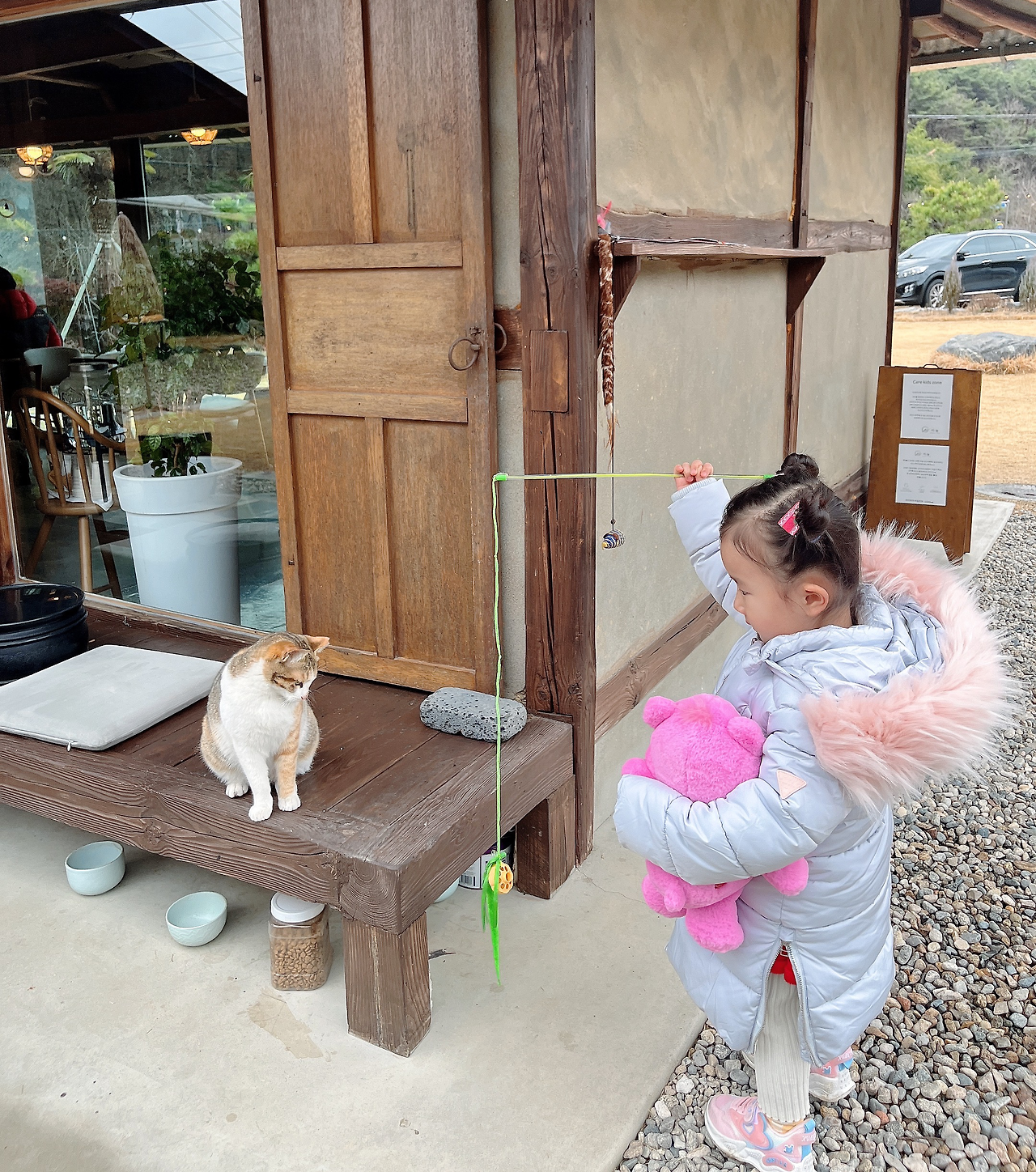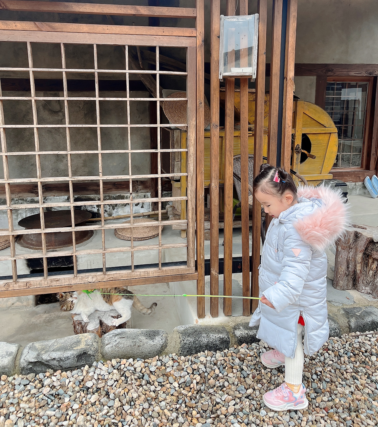 그동안수지가 동물을 본 건 동물원 가서 우리 안에 갇혀있는 동물을 보거나, 동네 산책하는 강아지를 지나다가 본 게 다였는데 직접 동물과 마당에서 자유롭게 노는 경험은 이번이 처음이었다. 고양이와 같이 있는 수지가 행복해 보였다. 아이와 고양이의 조합은 그저 사랑이었다.