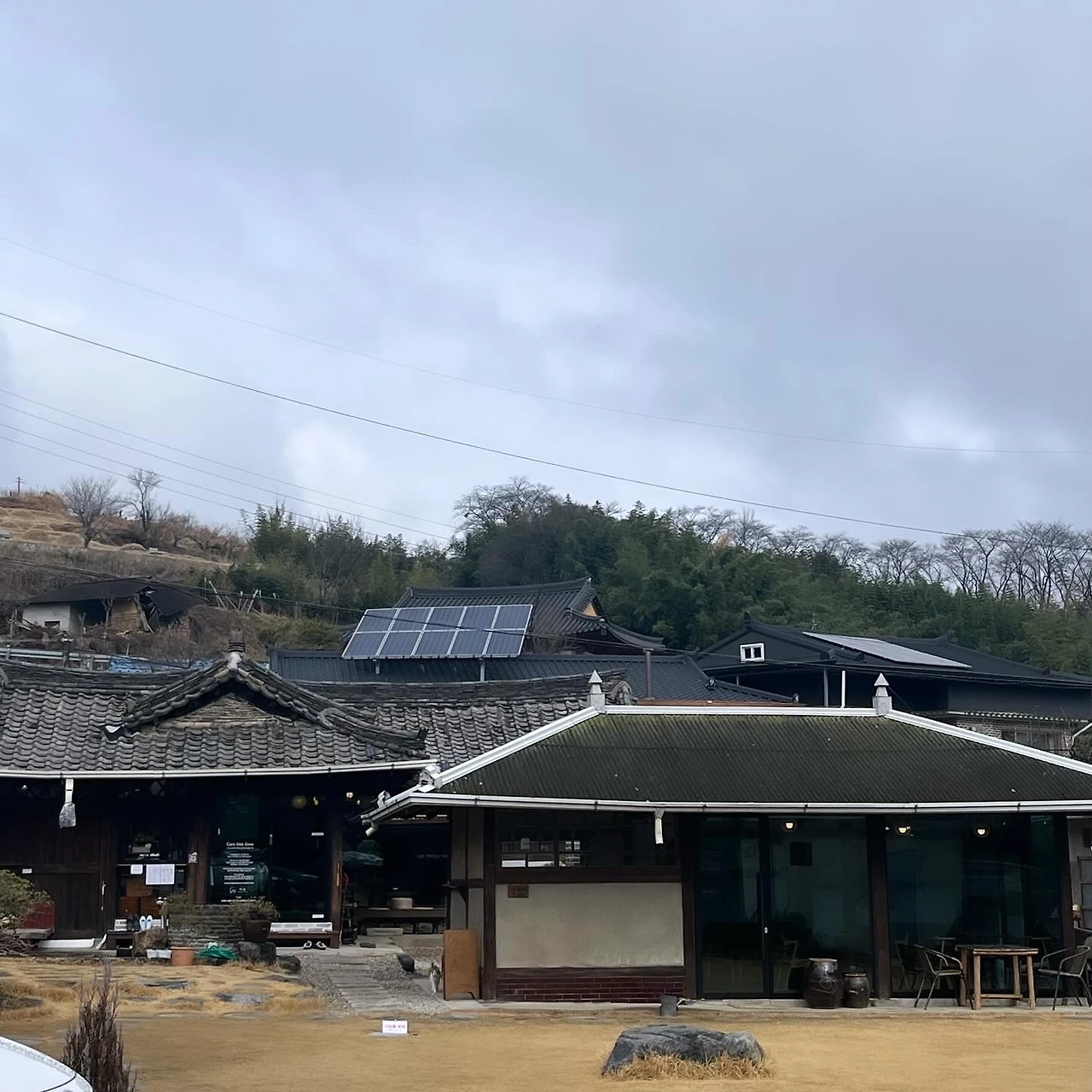 이 날은 날이 흐려서 구름이 낀 회색 하늘이었는데, 오히려 회색 하늘 배경이 한옥의 차분함을 더 살려주는 것 같았다. 가만히 창밖의 산을 바라보는 것만으로도 평안이 스며들었다. 자연이 주는 평안과 쉼을 한옥에서 느끼니 더 좋았다.