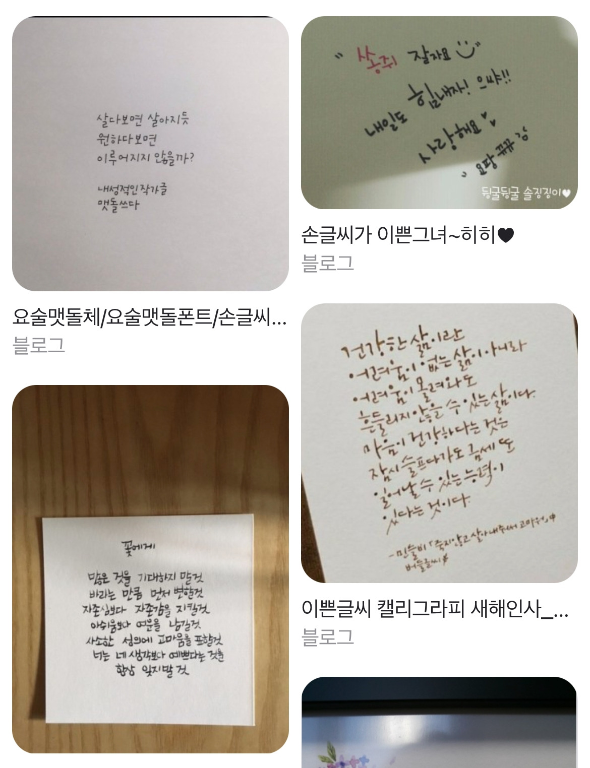 오늘 수첩에 손글씨로 메모하다가 글씨가 내 마음에 안 드는 모양으로 흘러갔다. 그걸 보고 ‘아, 나 글씨 연습 하는데 왜 이렇지’ 하는 생각이 들었다. 그러다 인터넷에 이쁜 손글씨라고 검색을 해봤다. 검색 결과에는 내가 연습하는 책에 있는 글씨 외에도 무수히 많은 여러 모양의 글씨체가 쏟아져 나왔다.