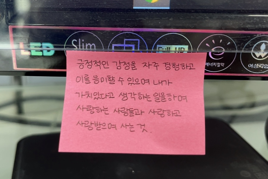 남들에게 보여주기 위한 글씨가 아니라, 나 스스로 만족하기 위한 글씨를 쓰다 보니, 아주 작은 부분에서도 만족감을 느끼는 것들이 더 많아졌다. 늘 가지고 다니는 수첩, 매일 보는 업무일지, 회사 사무실 컴퓨터에 포스트잇으로 붙여놓은 여러 메모들에 적힌 글자들까지 또박또박 신경 써서 적은 걸 보면 기분이 좋다.