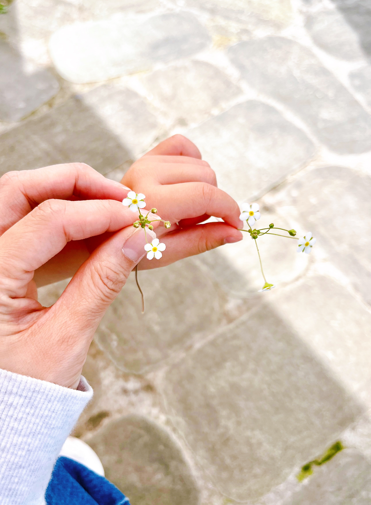 그리고 꽃을 보러 간다고 아빠 손을 잡고 조금 더 멀리 갔다. 풀을 만지는 것 같더니, 잠시 후 수지가 손에 무언가를 들고 “엄마~!” 하며 나에게 뛰어왔다. 수지 손에는 작은 꽃이 들려있었다.