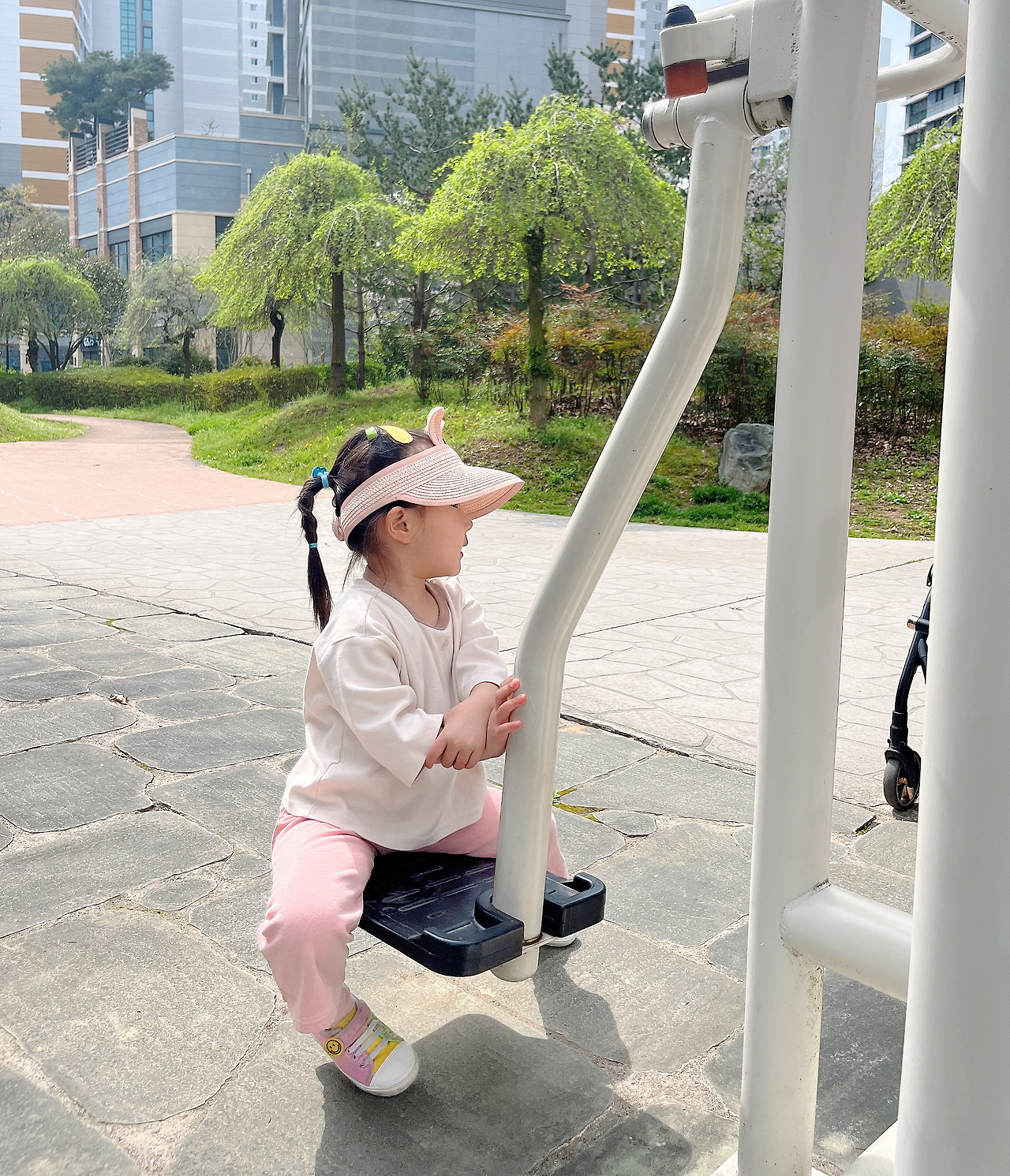 걸어가는 길에 운동기구가 보이자 수지는 그 앞에서 멈췄다. 요즘 수지가 그냥 지나치지 않는 운동기구다. 수지는 그네를 타듯이 재밌어했다.
