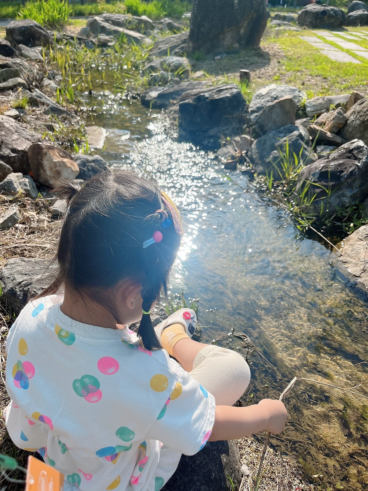 또 조금 걷다 보니 공원에 졸졸졸 흐르고 있는 개울물을 만났다. 수지가 개울물을 그냥 지나칠 리 없다. 근처에서 바로 나뭇가지를 하나 줍더니 개울물 낚시를 할 거라며 돌 위에 앉았다. 그리고 수지는 낚시를 하기 시작했다. 열심히 나뭇가지를 물에 담그며 한껏 집중해서 낚시를 하는 수지는 영락없는 꼬마 낚시꾼이었다.