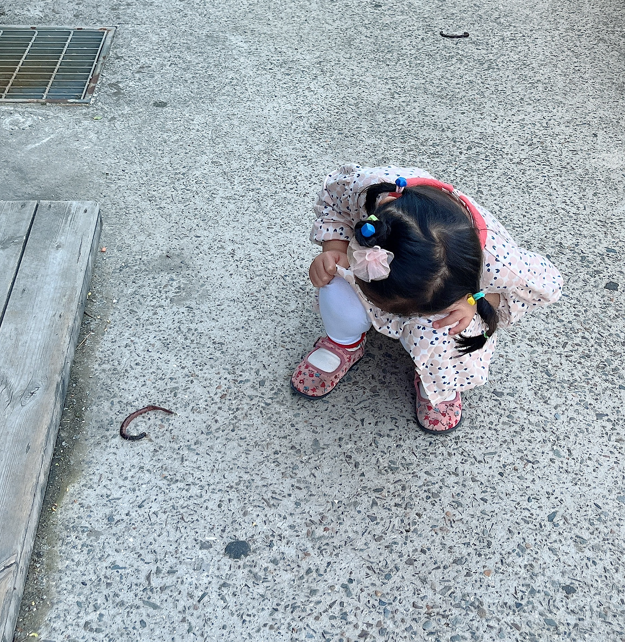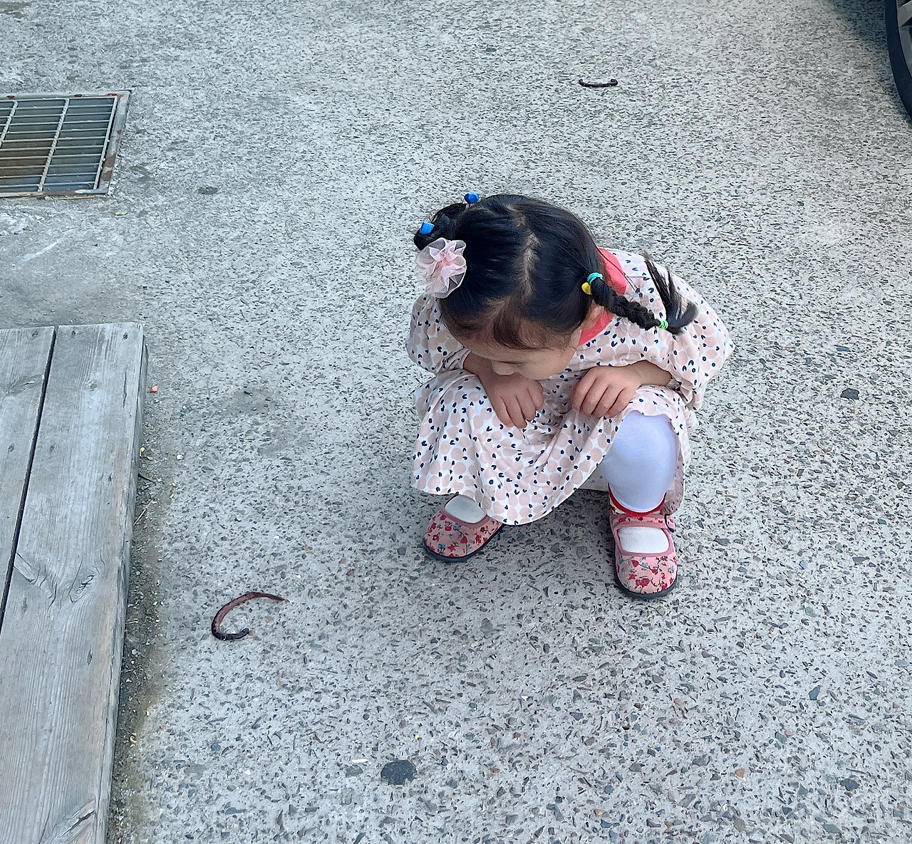 난 지렁이 보는 것도 징그러워서(지렁이 미안) 제대로 보지도 못하는데, 수지는 옆에 딱 붙어서 고개를 숙이고 관찰한다. 지렁이를 보면서 아이는 무슨 생각을 하는 걸까. 지렁이를 보는 아이를 볼 때마다 궁금하다.