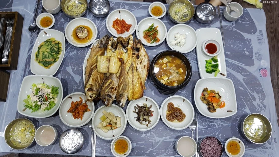 한참 귀여운 놀이를 하고 있다 보니, 음식이 나왔다. 메인메뉴는 생선구이인데 된장찌개에 부추전에 각종 밑반찬이 한상을 가득 채운다. 보기만 해도 배가 부른 푸짐한 한상이다.