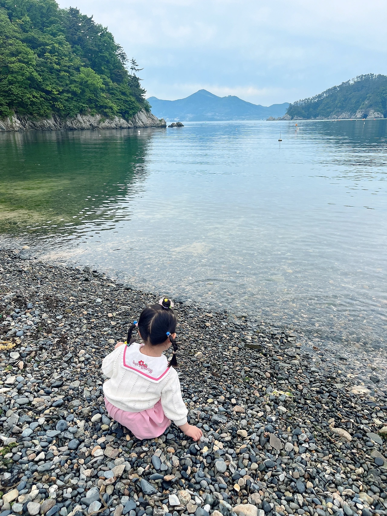 우리는 바다를 더 가까이서 보기 위해 해변으로 내려갔다. 벨버디어 앞 해변은 몽돌해변이어서 동글동글 돌을 밟으며 걷는 느낌이 모래사장을 밟는 것과는 다른 느낌으로 좋았다. 바다 가까이에 간 수지는 돌을 집어 들어 바다로 퐁당퐁당 던지며 놀았다. 난 그런 수지 뒤에 자리 잡고 앉았다.
