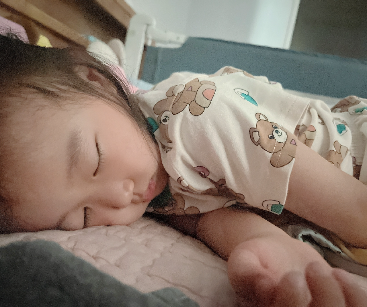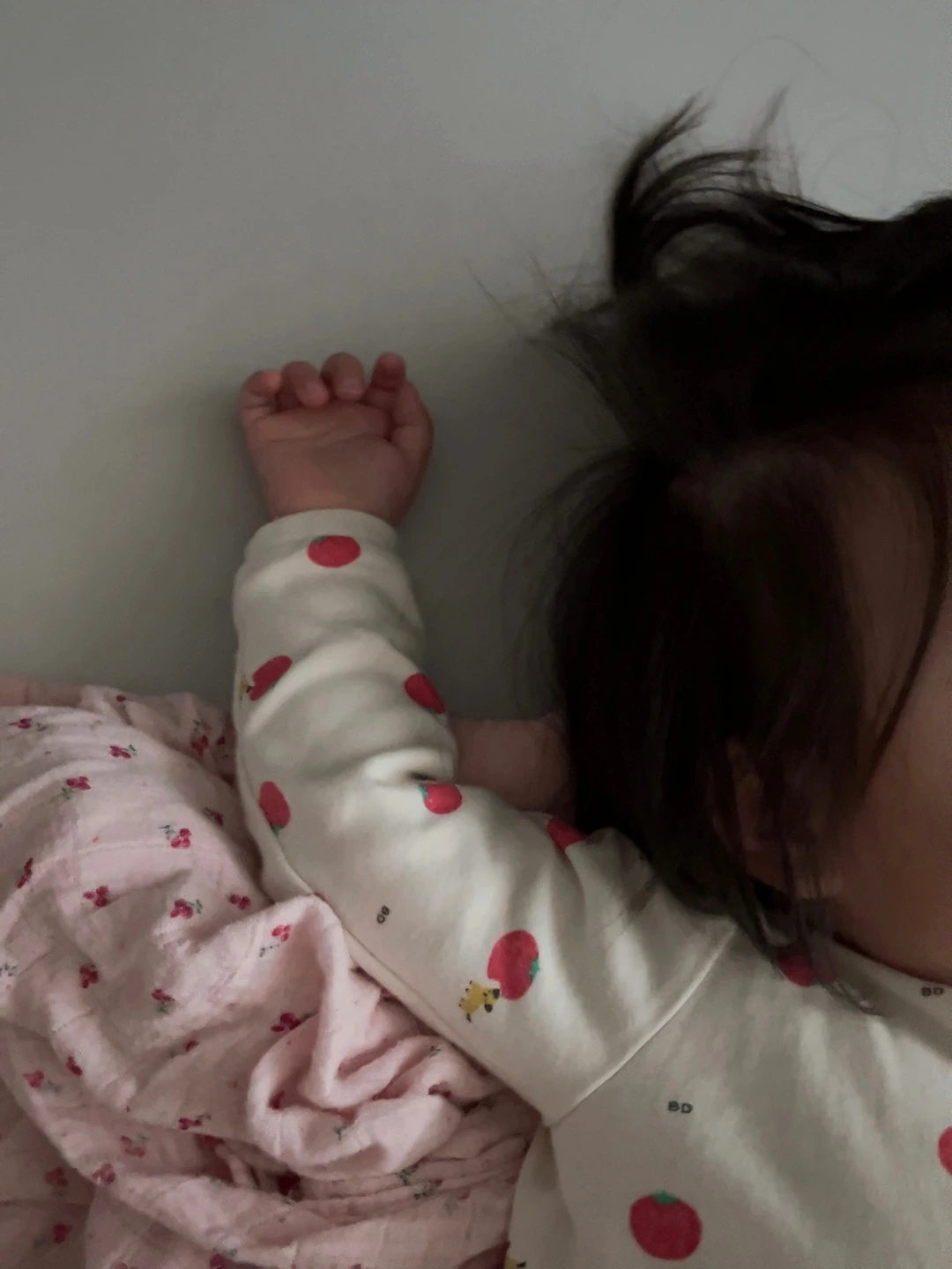 몸을 옆으로 돌려 자느라 통통한 볼살이 아래로 쳐진 것도 너무 귀엽고, 동그랗게 살짝 쥔 주먹손도 너무 귀엽다. 그리고 많이 컸지만 여전히 작은 아이의 발은 꼭 잘 구워진 빵처럼 생겼다. 머리부터 발끝까지 너무 귀엽다.