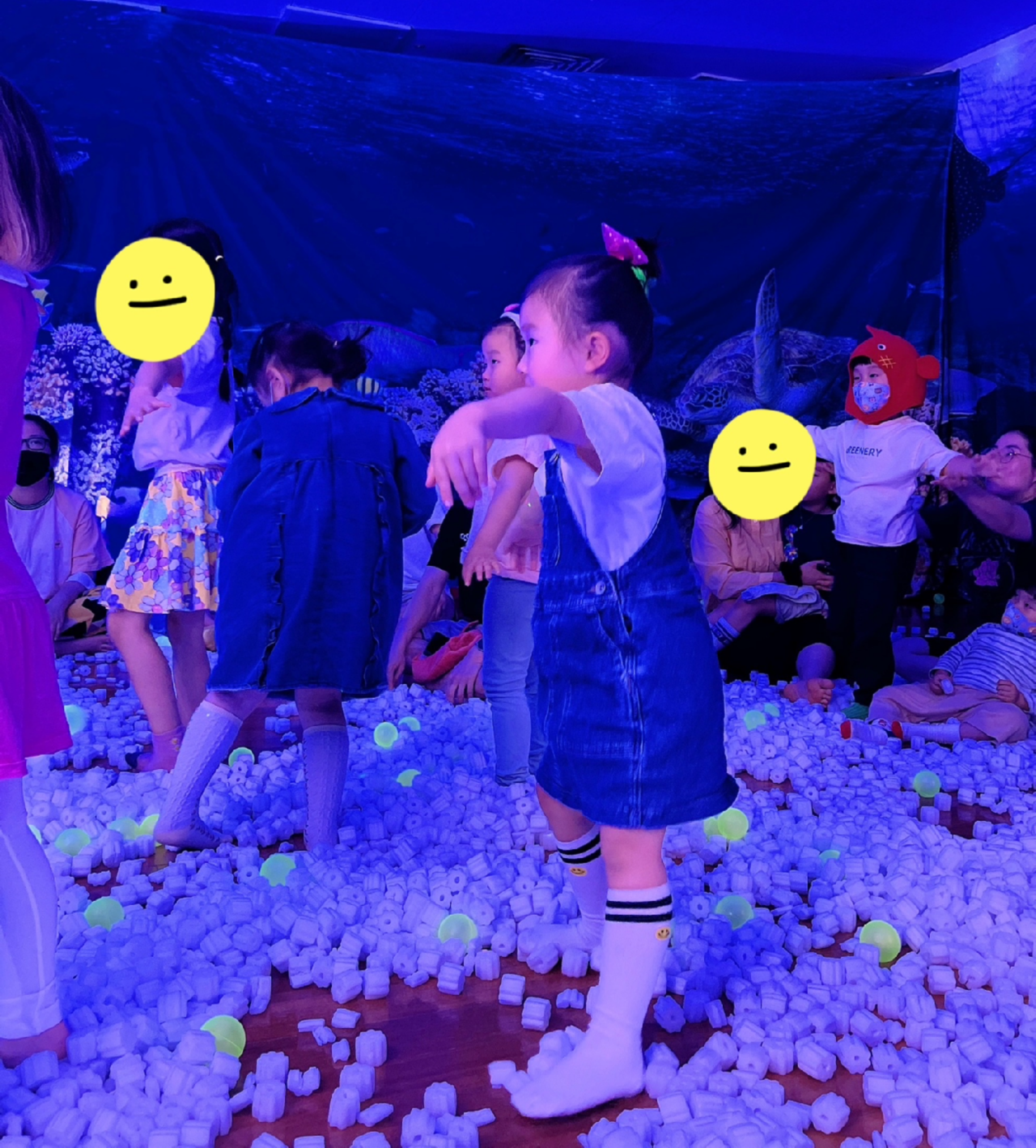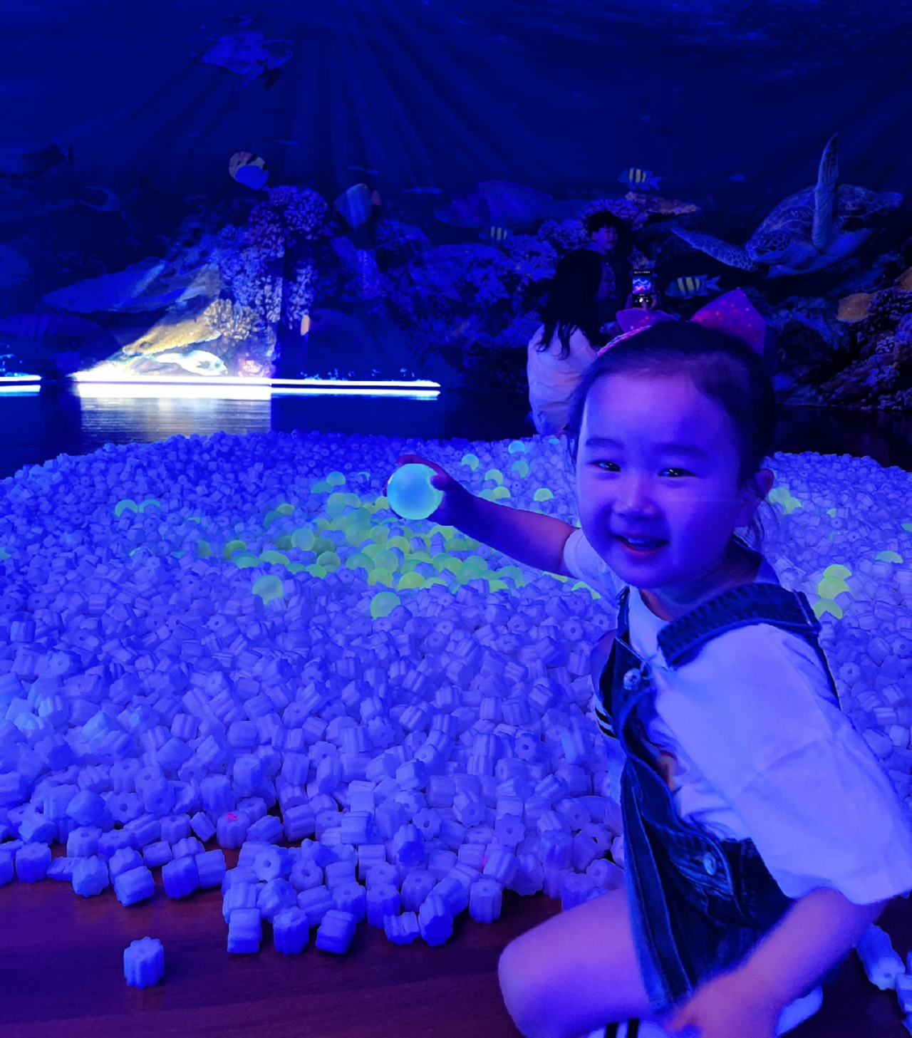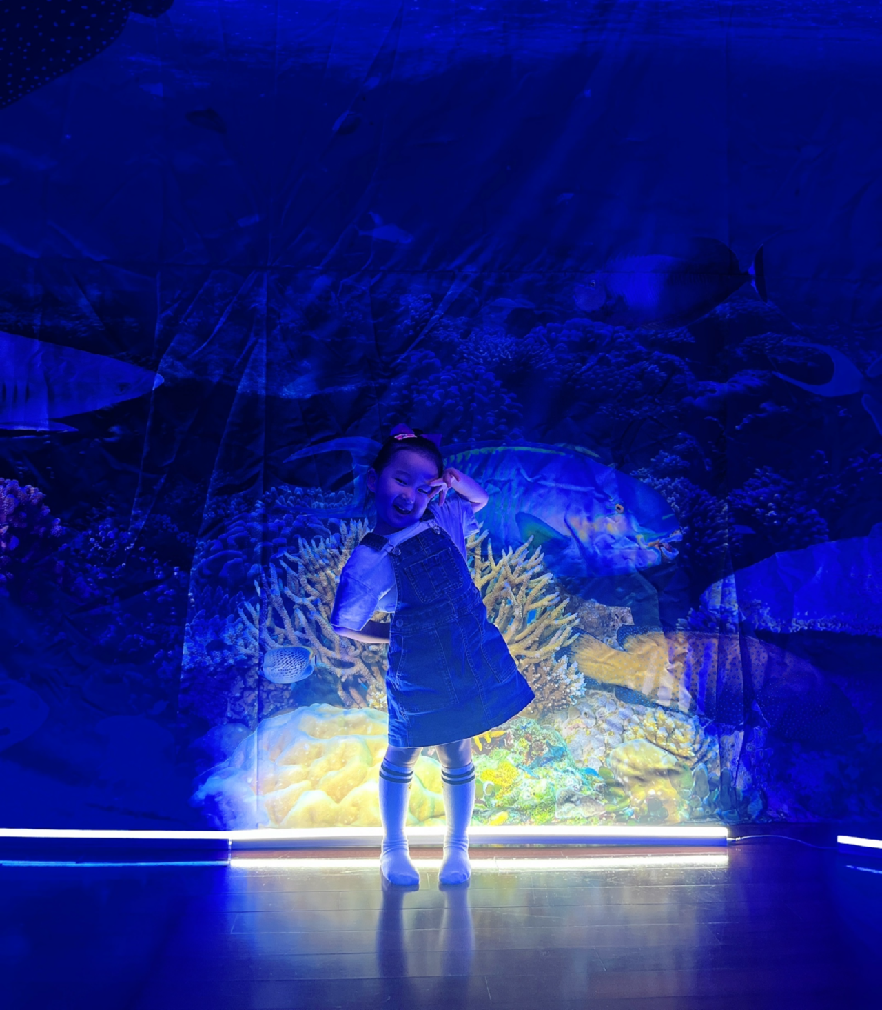 교실로 들어가니 조금 어두웠지만 알록달록한 조명이 은은하게 빛을 내고 있었고, 벽면은 전부 바닷속 사진이었다. 정말 바닷속으로 들어온 듯한 느낌이었다. 바닷속 분위기로 꾸며진 이 공간을 보고 수지가 흥미로워하며 좋아했다.