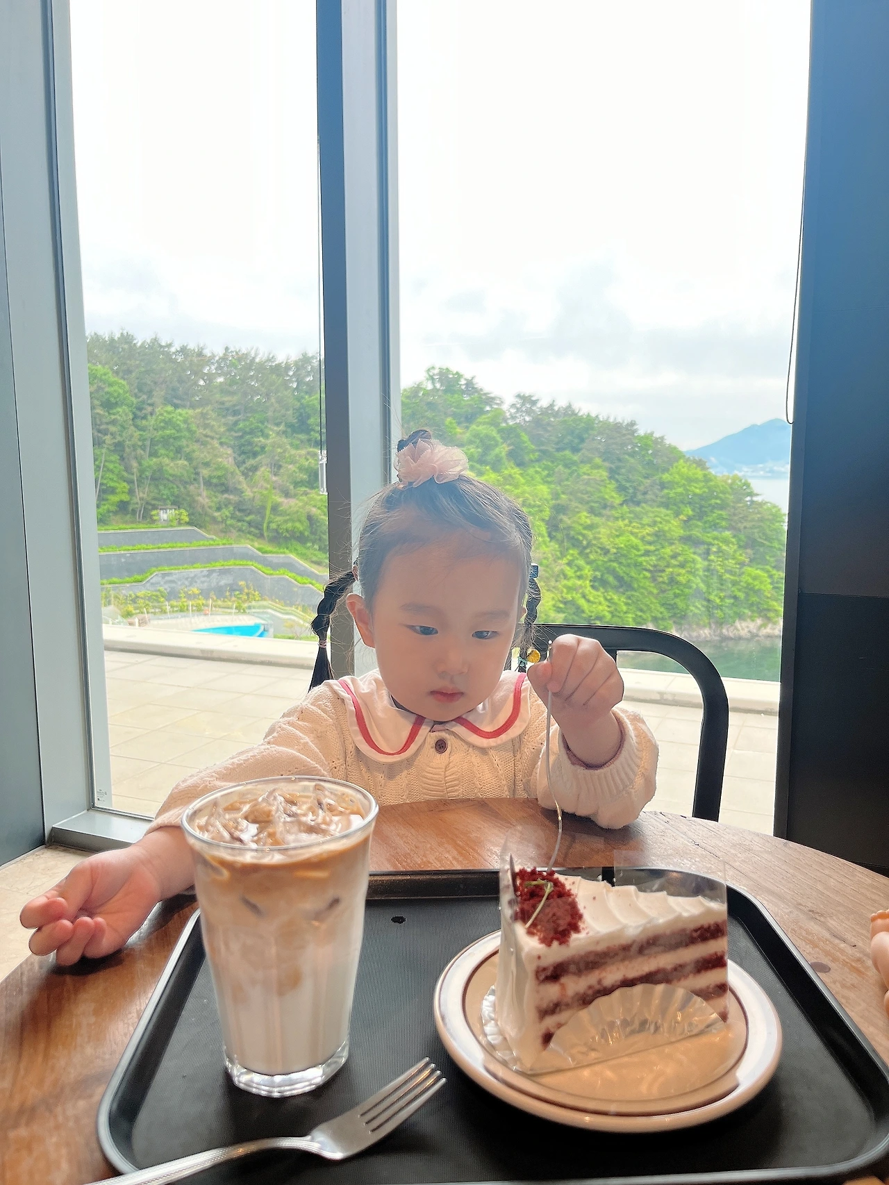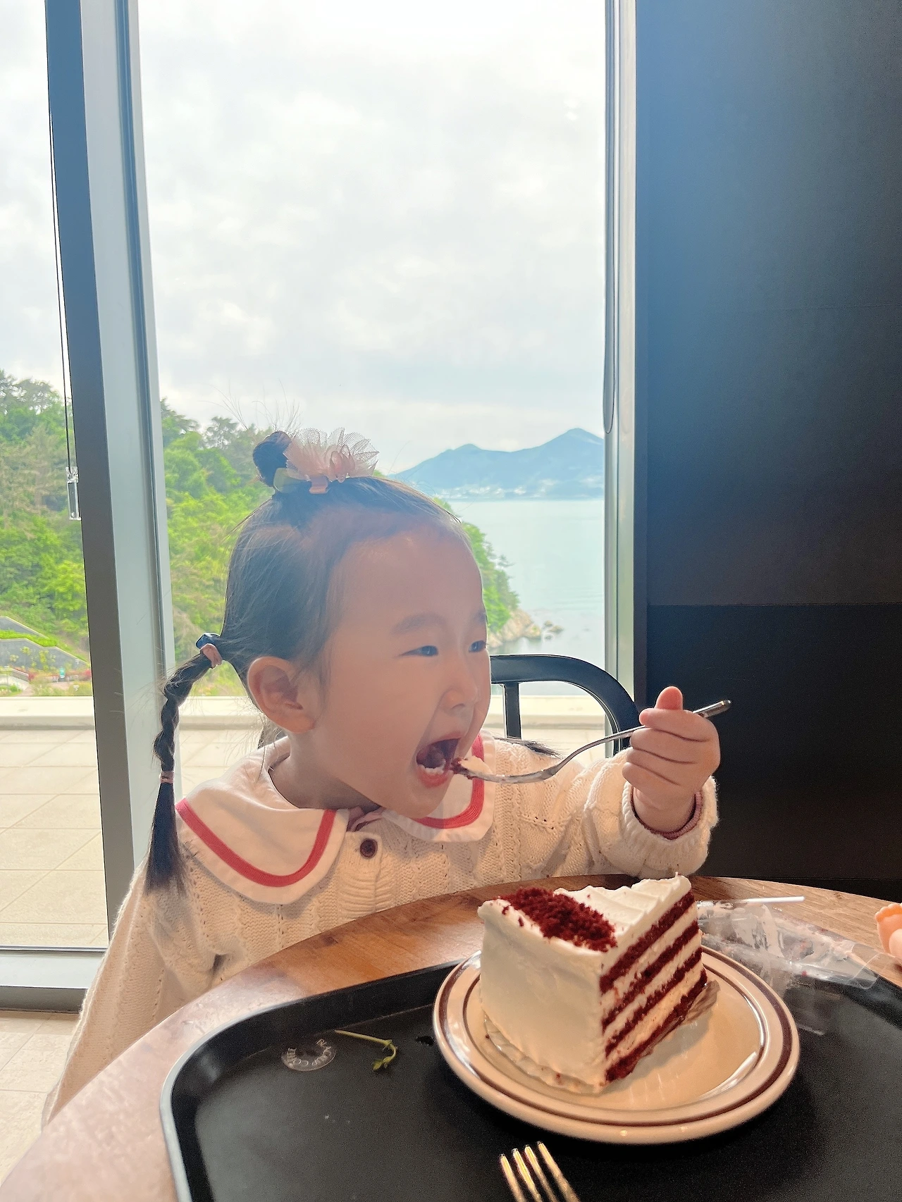 한참 바다를 멍하니 바라보다가 내 앞에 앉아있는 수지를 봤다. 입가에 케이크를 묻혀가며 야무진 포크질로 맛있게 먹고 있는 아이가 너무 귀엽다. 지금 이 순간, 보고 싶은 바다를 보며 사랑하는 아이와 카페에서 여유를 누리고 있는 게 정말 행복했다. 여행 마지막 시간까지 여유와 행복으로 빈틈없이 채우는 느낌이었다.