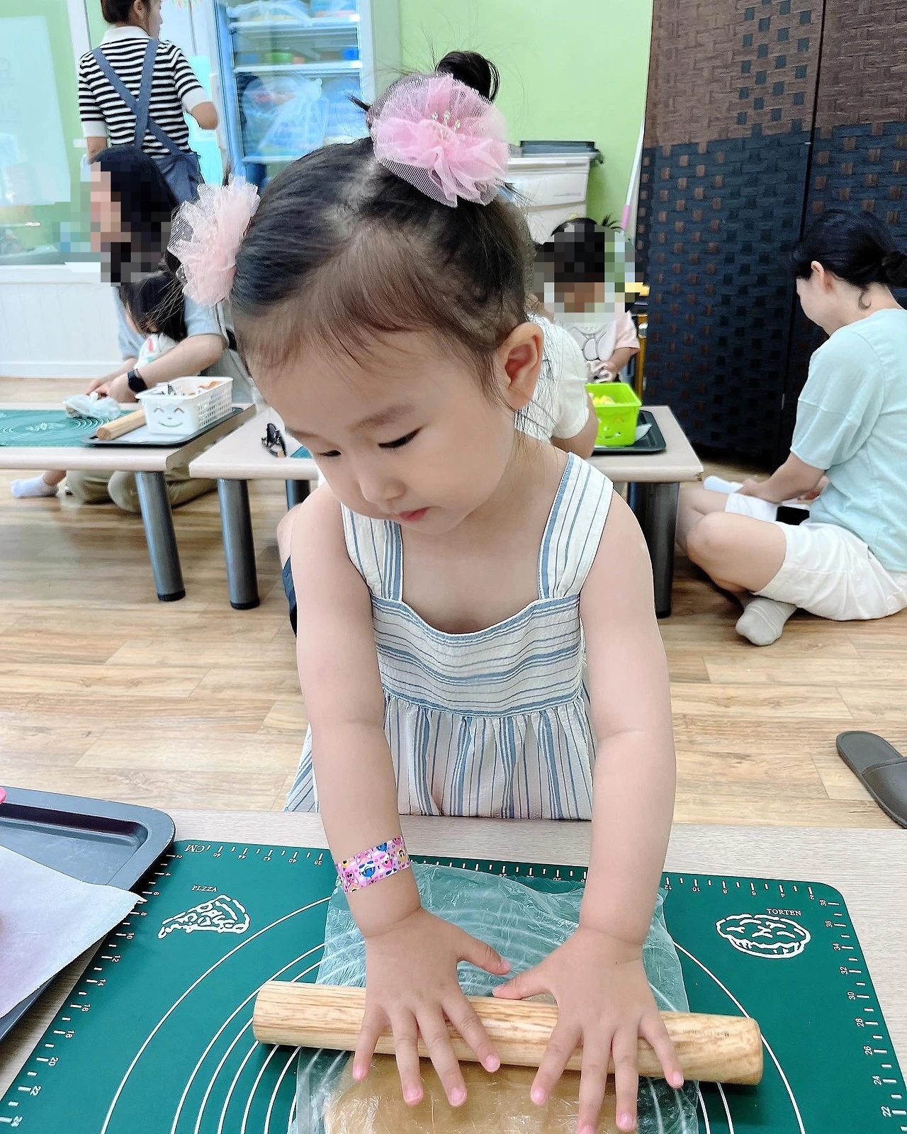 먼저 첫 순서로 쿠키 만들기를 했는데 이미 실내 놀이방을 본 수지는 놀이방으로 가고 싶어 엉덩이가 계속 들썩인다. 그래서 수지에게 이거 쿠키 만들고 가보자 하고 달래 가며, 반죽을 만져보게 하고, 쿠키틀에 관심 돌리게 하면서 쿠키를 같이 만들었다.