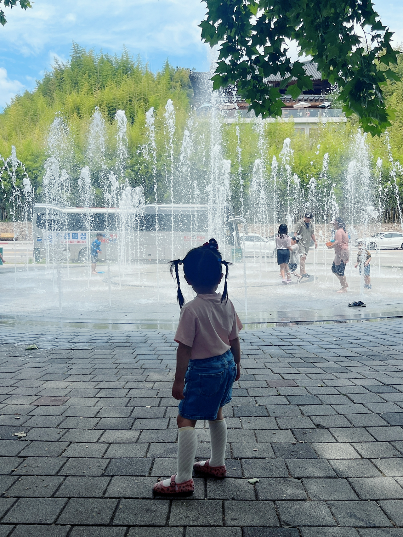 주차장에서 죽녹원으로 가는 길 중간에는 공원이 있었는데 공원 분수에서 물이 콸콸 솟아오르고 있었다. 아이들은 물속에 뛰어들어 온몸을 적셔가며 신나게 놀고 있었다. 수지는 여벌 옷이 없어서 물에 들어가진 못했지만 손에 물이 닿은 것만으로도 “엄마 내 손에 물이 묻었어!” 하며 좋아했다.