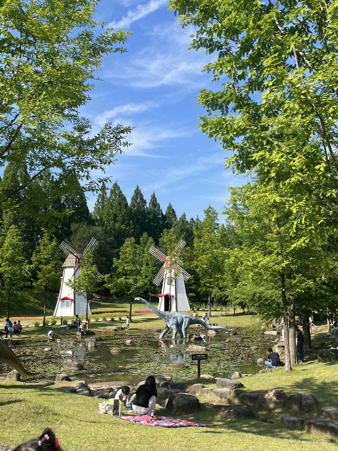 나무와 풀, 꽃으로 꾸며진 아름다운 공원엔 연못이 있었고 군데군데 공룡들도 있었다. 작은 쥐라기공원 같았다. 정말 아름다웠다. 이 공원에 피크닉을 온 가족들이은 여기저기 돗자리를 펴고 다들 각자의 시간을 즐기고 있었다.