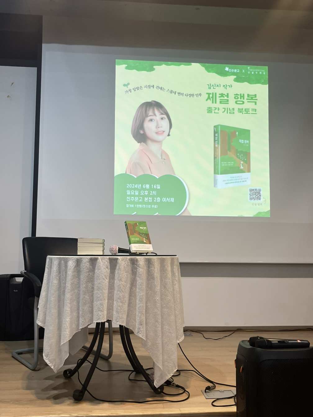 북토크는 진주문고 2층 여서재에서 진행됐다. 작가님이 무대 앞으로 나오시는데 사진으로 자주 봬서 그런지 뭔가 친근한 느낌이 들었다. 실제로 본 작가님은 동그랗고 초롱초롱한 눈이 귀여우셨고 평안하고 온화한 느낌이 드는 작가님의 글과 꼭 닮은 이미지였다.