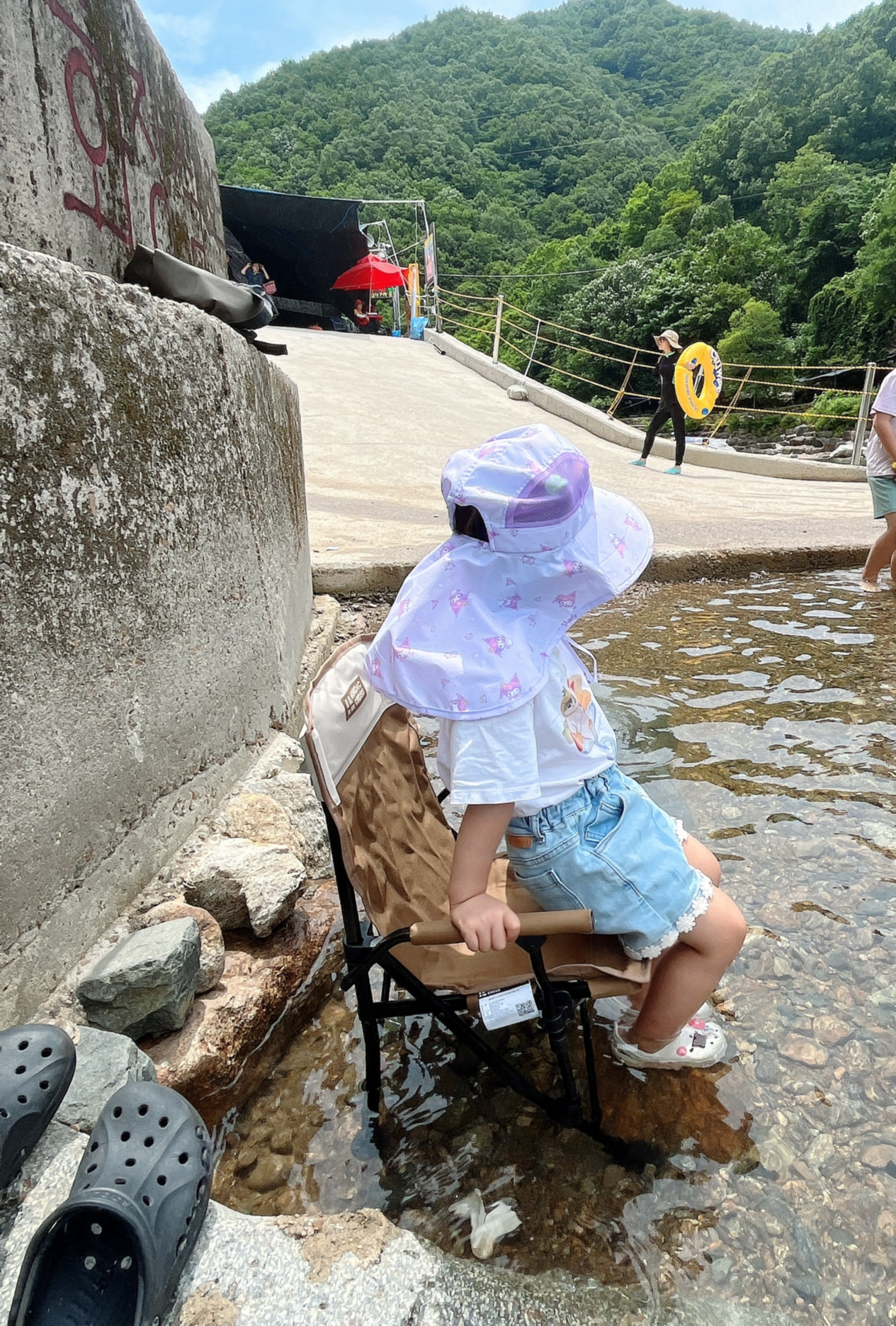 우리 부부도 아이를 억지로 물에서 놀게 할 생각은 없었다. 계곡물에는 정말 발만 담가도 시원하기 때문에 그저 계곡물의 시원함만 맛보고 오자는 생각이었다. 그래서 오래 있지 않을 것 같아 평상은 대여하지 않았고 대신 캠핑의자를 챙겨갔다.