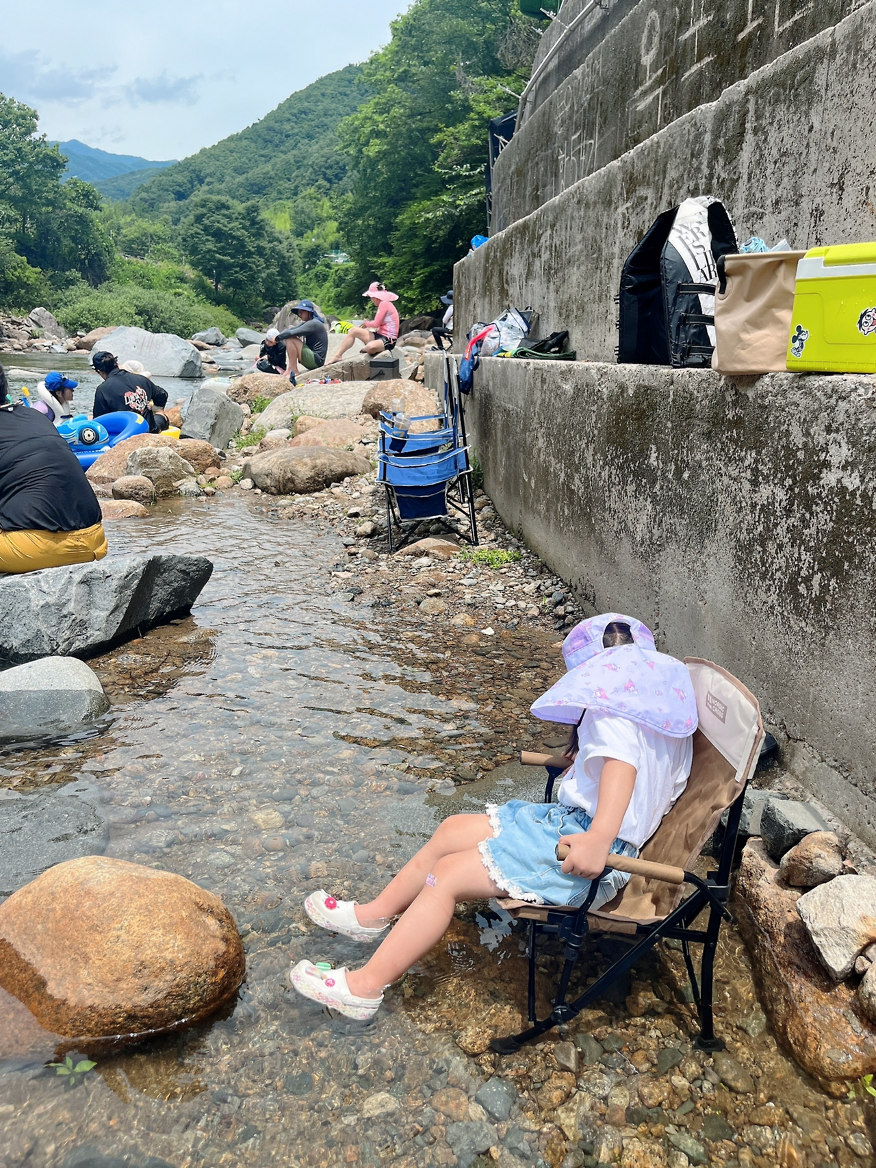 얕은 물가에 캠핑의자를 펴고 앉으니 발만 물에 들어갔다. 계곡물이 너무 차가워서 오히려 물에 들어가기엔 추울 것 같았고 발만 담그니 딱 좋았다. 나도 오랜만에 느껴보는 계곡의 시원함에 기분이 좋아서 의자에 앉아 발을 물에 넣고 통통 거리며 좋은 기분을 표현했다. 수지도 내 옆에서 나를 따라 작은 발을 통통 차며 즐거워했다.