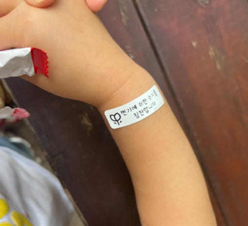 유치원에서 수지가 쉬 했다는 연락을 받은 다음 날, 수지는 팔에 “변기에 쉬한 수지를 칭찬합니다”라고 적힌 칭찬 스티커를 붙이고 하원했다.