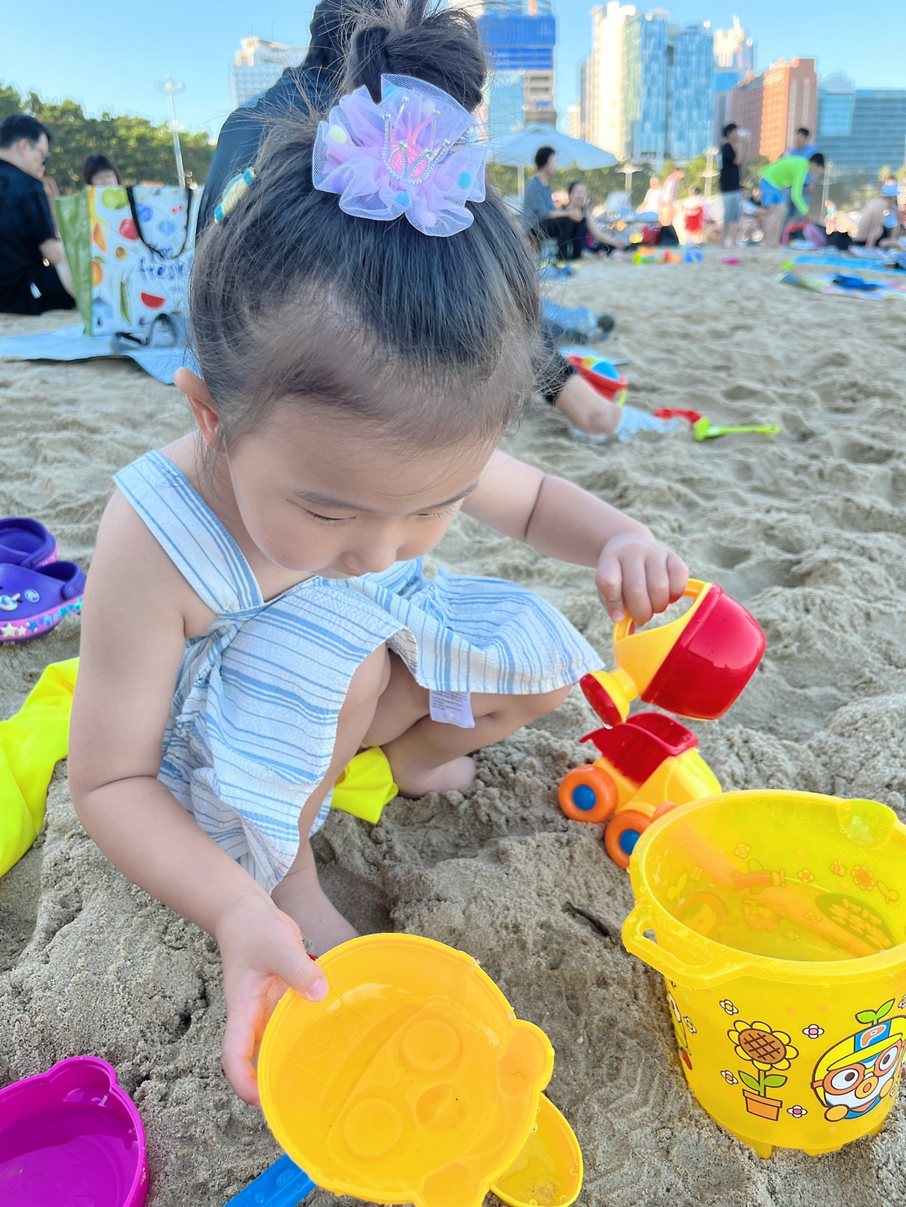 우리는 부산국립과학관에 가서 수지와 즐거운 구경을 하고 해가 그리 뜨겁지 않을 시간인 6시쯤에 해운대 바닷가에 갔다. 수지는 바다 수영은 아직 무서워해서 못하지만 대신 모래놀이를 무척 좋아한다. 우리는 모래놀이 도구를 챙겨 갔고 수지는 바닷가에 도착하자마자 그늘에 자리 잡고 앉아 모래놀이를 시작했다.