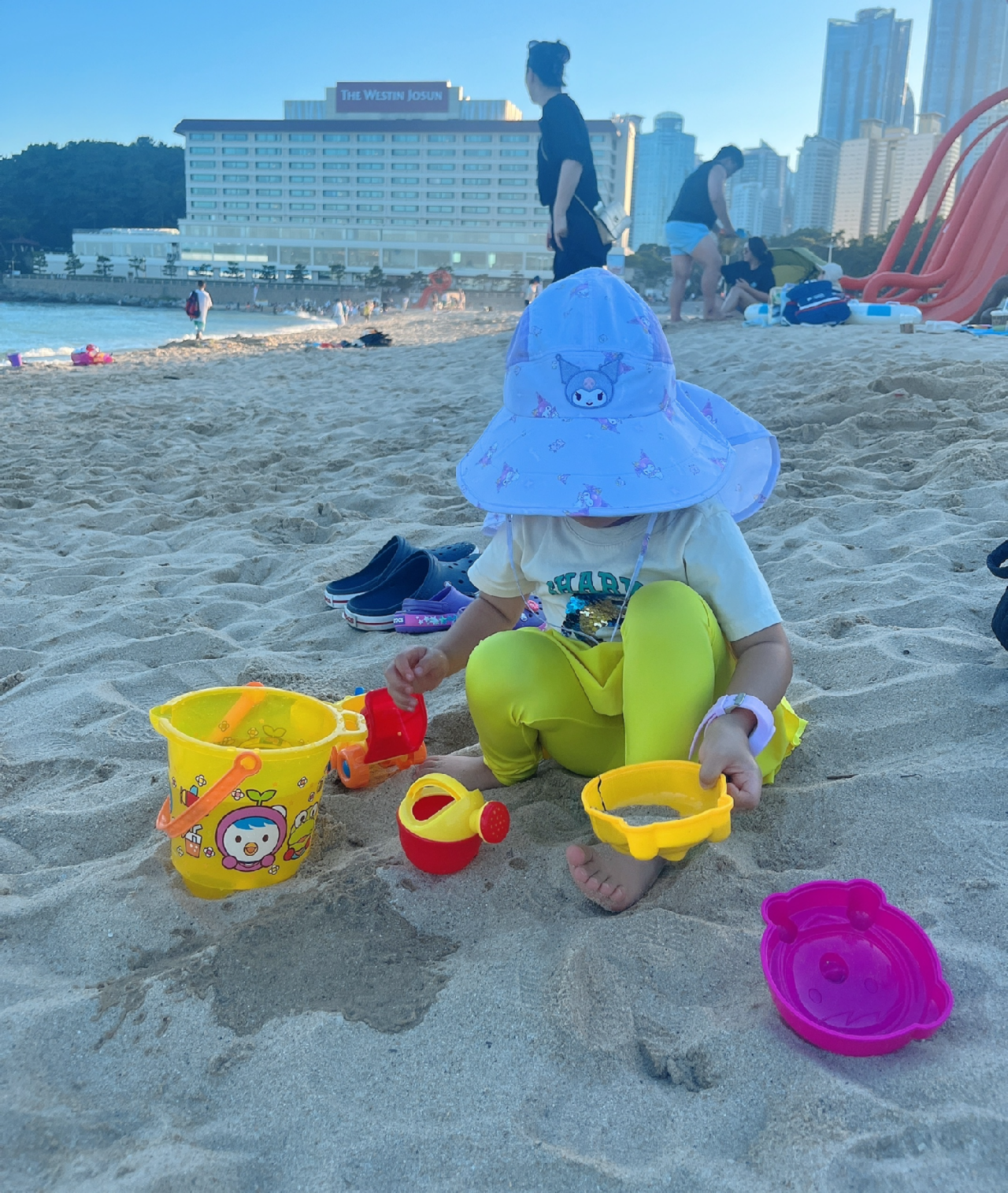수지는 모래놀이에 집중하고 나와 남편은 바닷물에 발을 담궜다. 차가운 바닷물이 발에 닿자 하루동안의 피로가 다 씻겨 내려가는 느낌이었다. 뜨끈한 물로만 피로가 풀어지는 줄 알았는데 시원한 바닷물로도 피로가 풀어지는구나 싶었다.