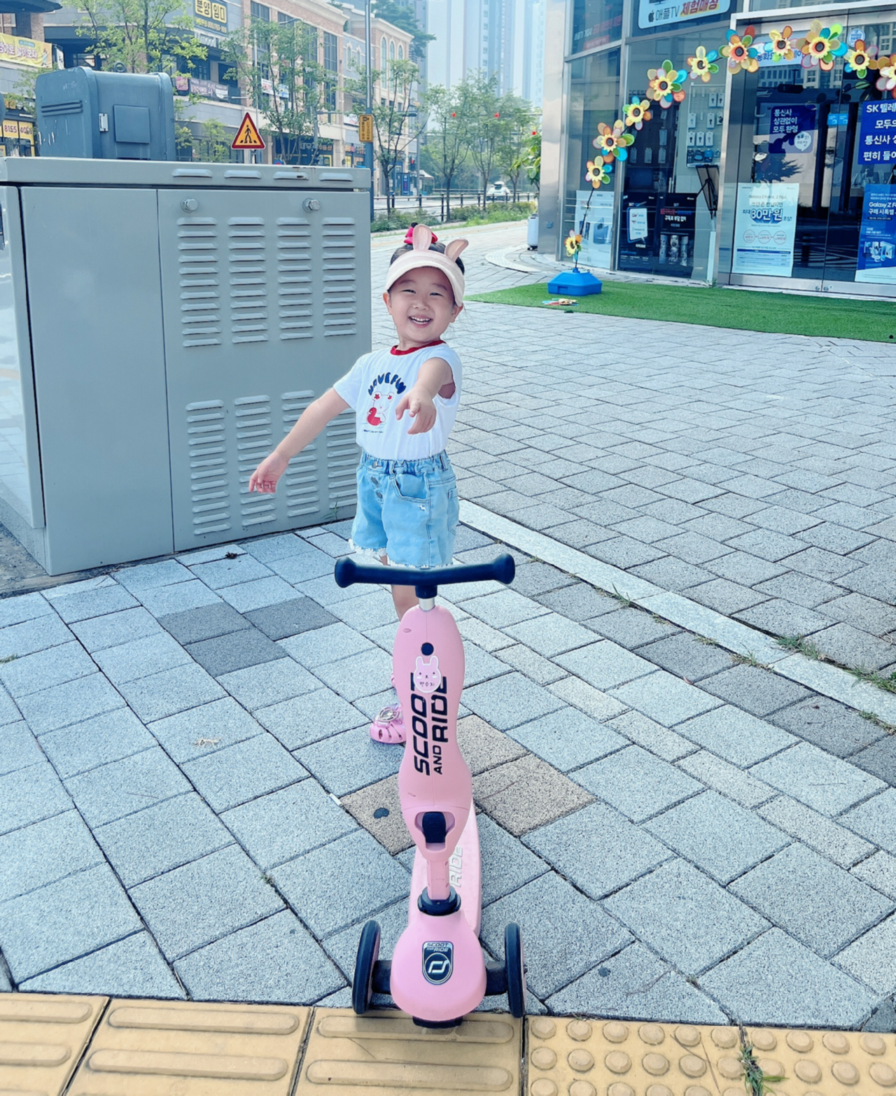 더워도 수지는 킥보드를 타고 씩씩하게 달려갔다.