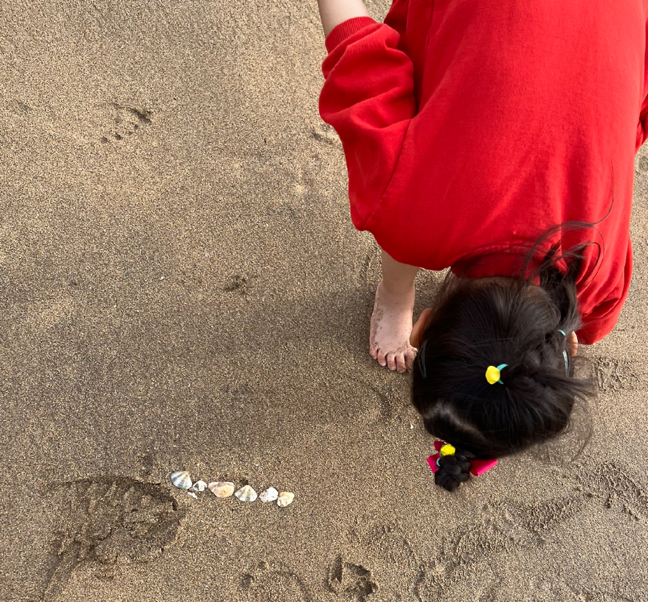 그리고 작은 손안에 조개껍데기를 모은 걸 보여주며 "엄마 내가 조개 주웠어!"라고 자랑했다.