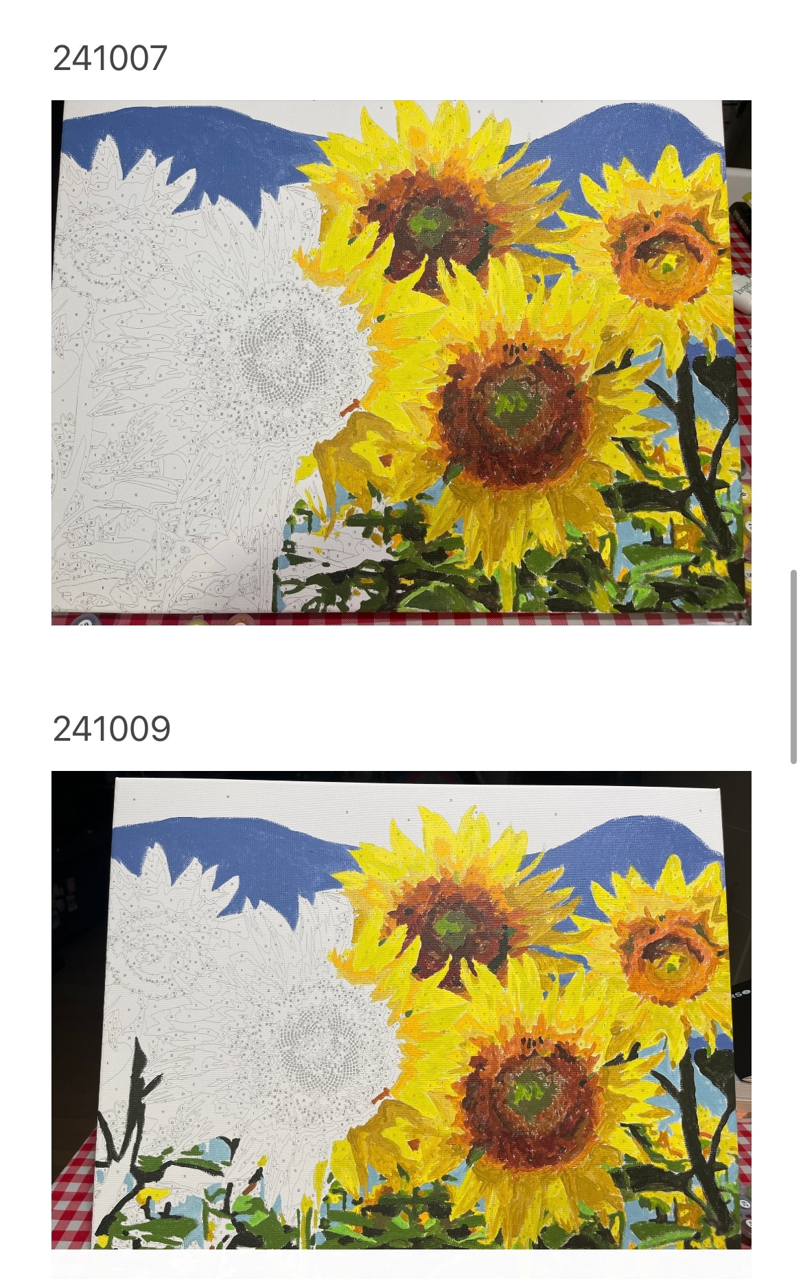 '빠르진 않아도 이 속도로 멈추지만 말고 꾸준히 해보자' 하고 하다 보니 하얀 캔버스에 색깔이 더해져 점점 내가 그리는 해바라기의 모양이 나오기 시작했다. 그릴 때마다 달라지는 그림을 보며 뿌듯함과 성취감을 느꼈고, 그리는 과정을 기록으로 남겼다. 기록으로 남기다 보니 '내가 이만큼 했구나' 하는 과정을 한 눈에 볼 수 있어 좋았다. 그리고 그림을 그린 날에는 작은 성취감을 마음에 안고 하루를 마무리할 수 있었다.