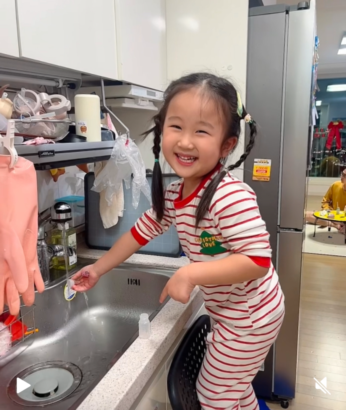 나는 “엄마 설거지 다 하고 나서 수지가 해~”라고 하니까 수지가 “네에”라고 대답하고 내 옆에서 얌전히 기다렸다. 내 오른쪽에 서있는 수지 앞에 건조대가 있어, 식기류를 씻고 놔둘 때 수지가 중간에 있어 조금 불편하기도 했지만, 자기도 설거지 할 거라고 기다리고 있는 수지가 너무 귀여워서 뭐라고 할 수 없었다.