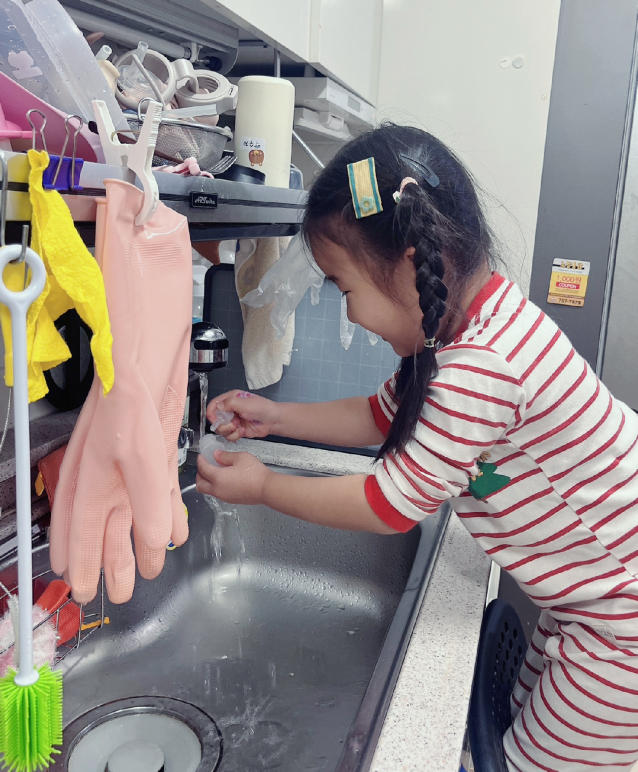 수지가 감기에 걸렸다. 병원에 가서 진료를 받았는데 다행히 단순한 콧물감기라 시럽약만 받았다. 병원을 다녀온 첫날, 수지는 약을 먹고 나서 자기가 먹은 약병을 본인이 씻을 거라고 했다. 그리고 설거지를 하고 있는 내 옆에 의자를 갖다 놓고 그 위에 올라섰다.