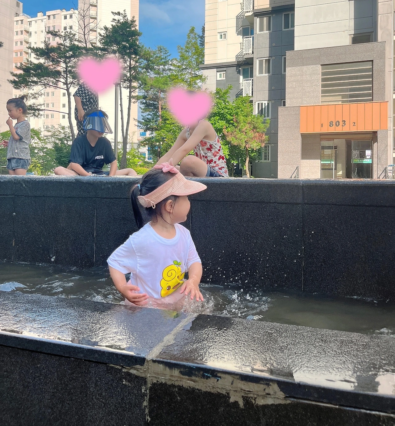 그리고 내가 걷던 그 길 건너편 우리 아파트 단지 안에 물놀이할 수 있는 분수를 틀어줘서, 아이들이 신나게 물놀이를 하고 있었다.