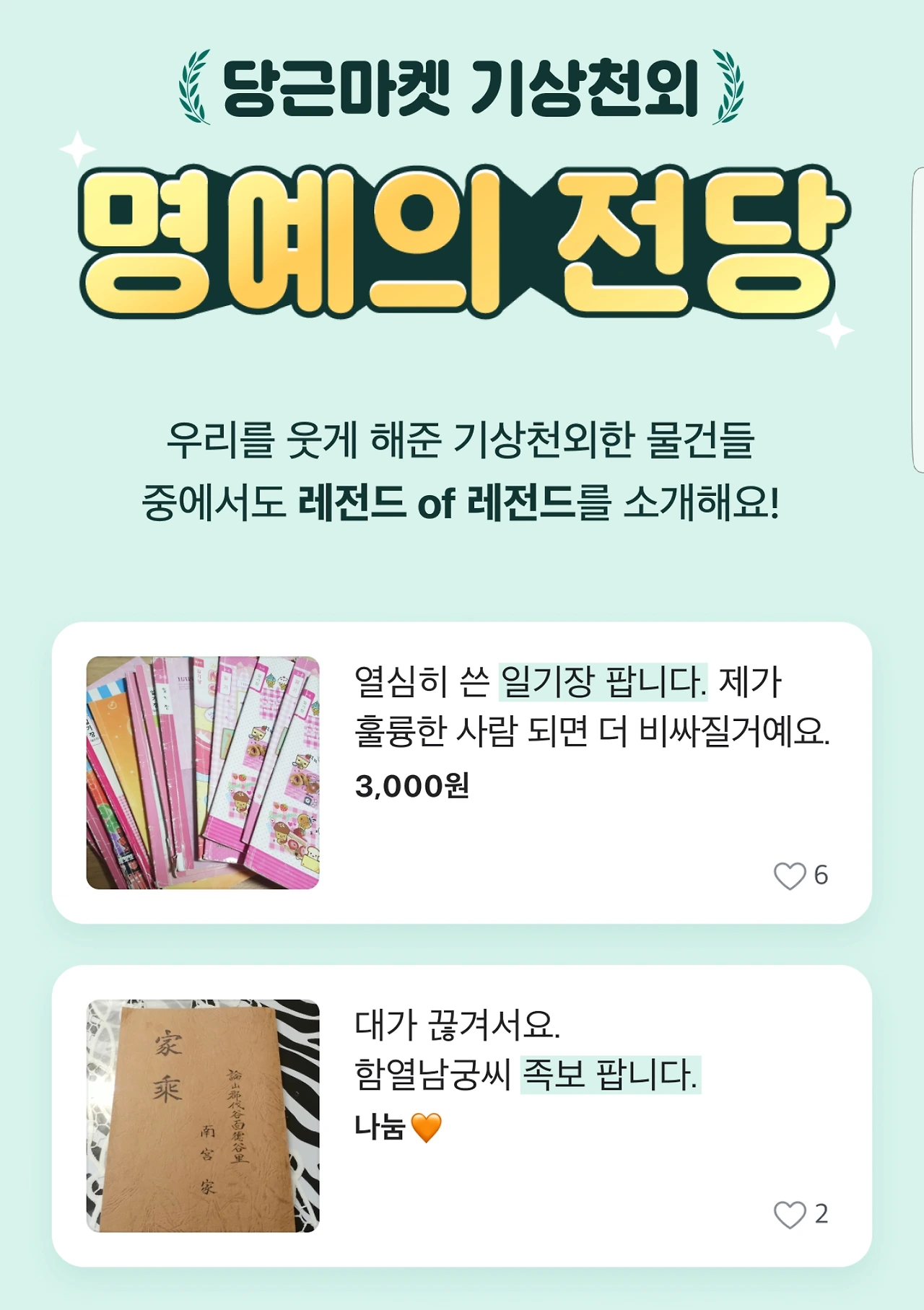 당근의 세계를 들여다보면 판매자 수만큼의 다양한 세계를 경험하게 된다. 뭐 이런 것까지 판매하나 싶을 정도의 분리수거함으로 직행해야 할 물건도 있고, 가치가 낮아 보이는 것들에 과도하게 높은 금액을 책정한 물건도 있다. 최근 글쓴이가 판매한 물건 중에는 디자인샵 제품의 강화유리도마가 있었는데, 이를 구매한 자는 트럭 몰고 오신 겸연쩍은 머리숱의 중년 남성이었다. 그는 새로 이사해서 도마가 필요했다며 궁금하지도 않은 말들을 내뱉고는 입이 귀에 걸린 채 집으로 돌아갔다. 당근의 세계를 감히 예측하지 말라. 지구를 품은 이 세계는 다양성이 존재하는 골 때리는 세계이다.