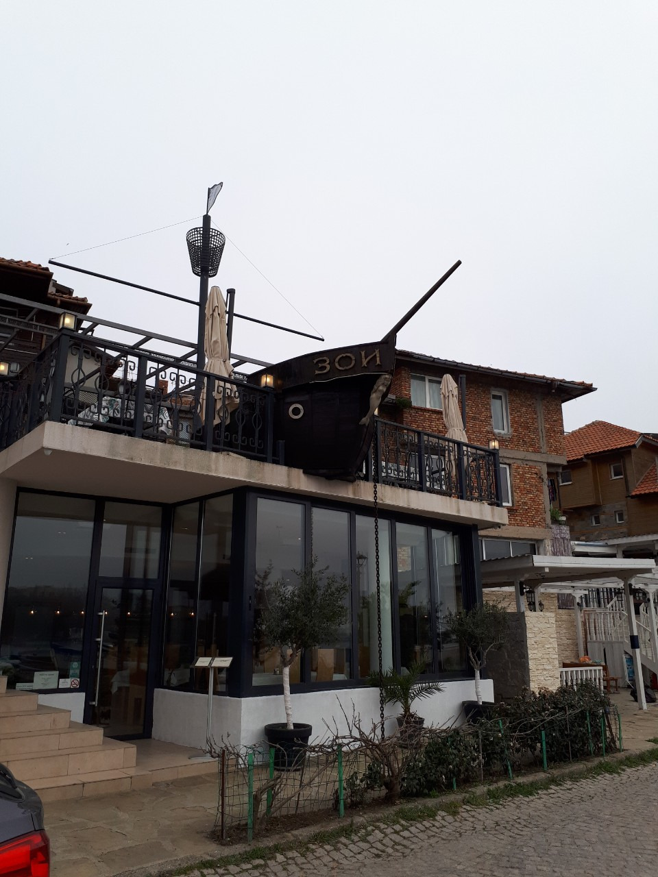 <Ресторан Зои. 이 키릴어를 읽으면 '레스토란 조이'이다. 배에 쓴 글씨가 바로 이것. 별거 아니다. 조이식당이라는 말. 이 식당 문닫았다. 개뿔이나 아무 것도 아닌 식당인데 지붕에 배 모양으로 장식하는 바람에 트립어드바이저에서는 겁나게 좋은 식당처럼 떠든다>