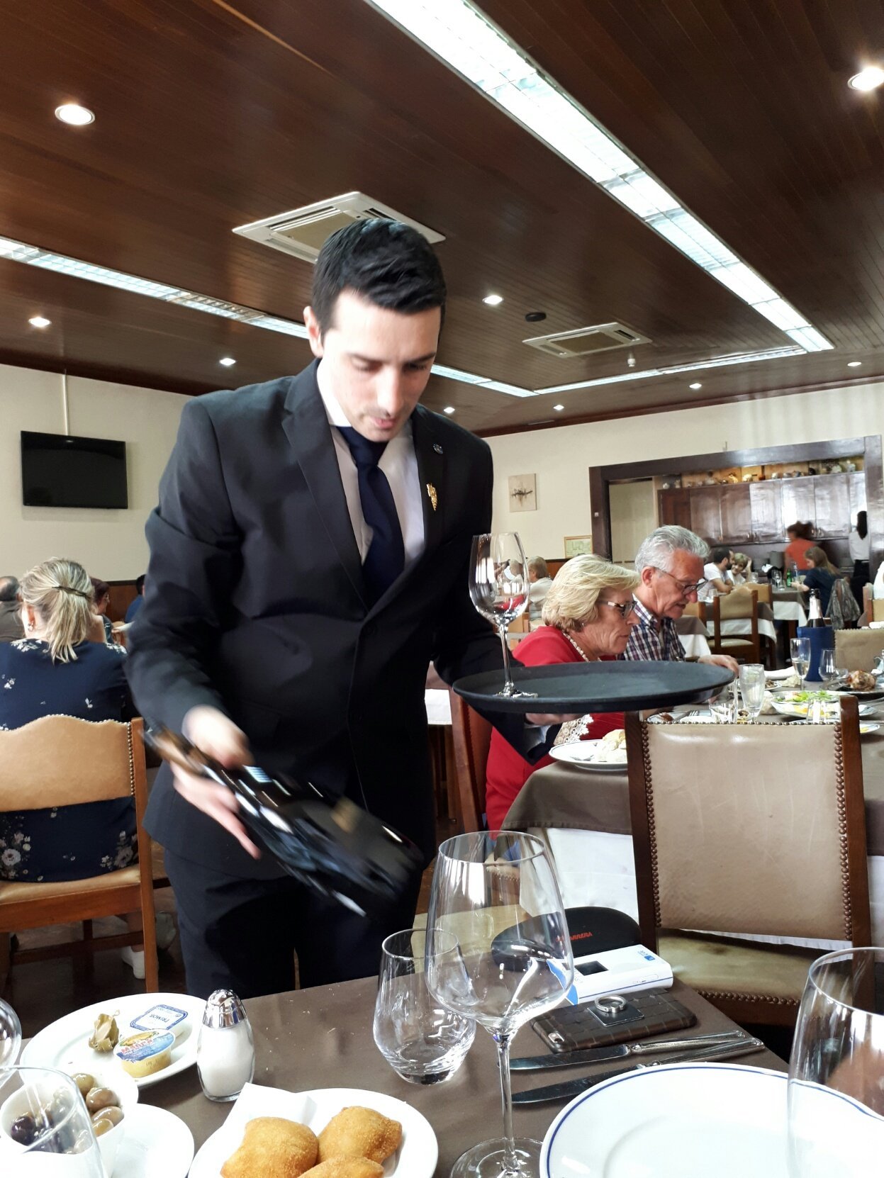 코임브라의 새끼돼지 요리 전문점. 전문 소믈리에의 왼쪽 깃에 금색 포도 뱃지가 전문 소물리에임을 나타내고 있다. 소믈리에가 권하는 와인 또 한병.