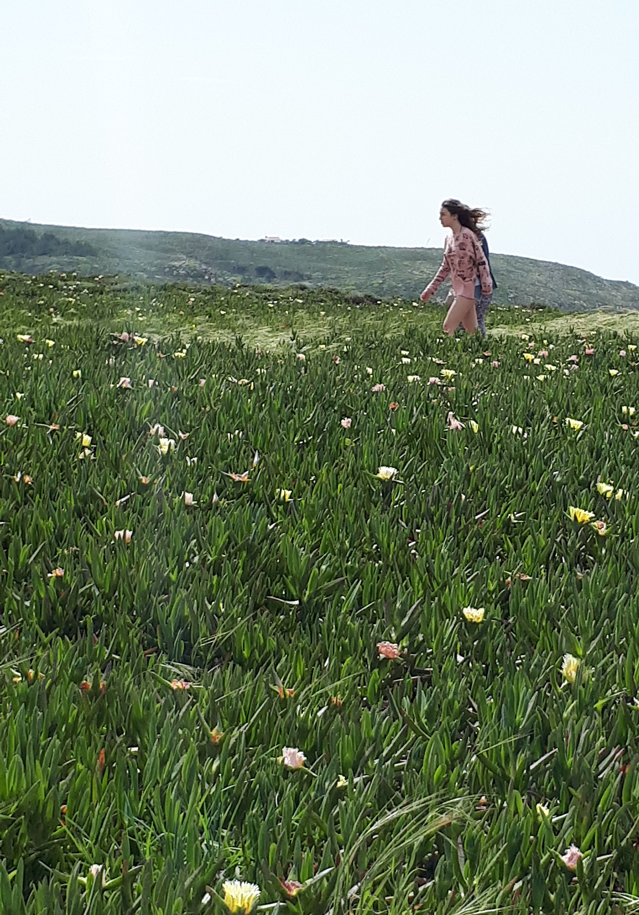 이 시는 십자가 돌탑 뒤에 새겨져 있다. 머리통 넣고 인증샷 찍는 게 그냥 하기 싫었다. 바람 부는 까보 다 호카의 벼랑 꽃밭을 지나는 꾸냥을 핸펀 카메라에 담았다.